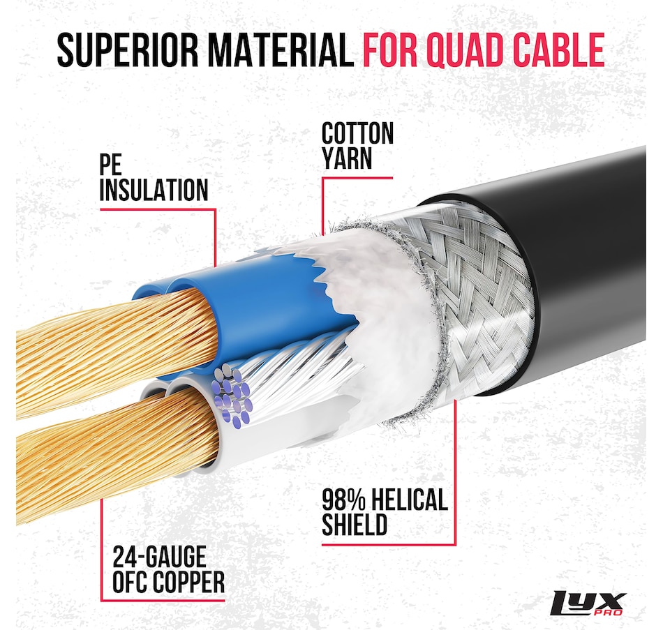 LyxPro Premium Quad Series XLR cables deliver great signal transfer and clear high-frequency transmission while giving good performance and maximum noise rejection. Each microphone cable (XLR to XLR) is durable and will handle life on the road. Each microphone cord is constructed of 24 AWG Oxygen-Free Copper (OFC), a 98% helical braided shield, and gold-plated contacts on the connectors for corrosion resistance. A versatile and resistant XLR male to female cable that will give you a pristine audio.