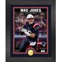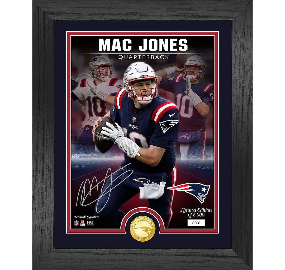 This is a limited edition collectible frame featuring an exclusive photo of Mac Jones with a minted New England Patriots coin. The 13" x 16" wood frame with double matting under glass features a custom three-image 8.5" x 11" photo of Mac Jones in action, with his facsimile (replica) signature. Each photo is hand numbered and matted with a 39mm solid bronze minted team coin. Available in a limited edition of only 5000 and officially licensed by the NFL and NFLPA, each signature photo mint is accompanied by a certificate of authenticity. This product is proudly made in the USA by The Highland Mint!