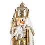 Deck the tabletops or the mantel with this beautiful wooden nutcracker. Standing on a courtly stripe base, it holds a golden scepter and wears a regal gold robe, trimmed with faux fur and courtly check. Please note these pieces may vary due to the handmade nature of each product.