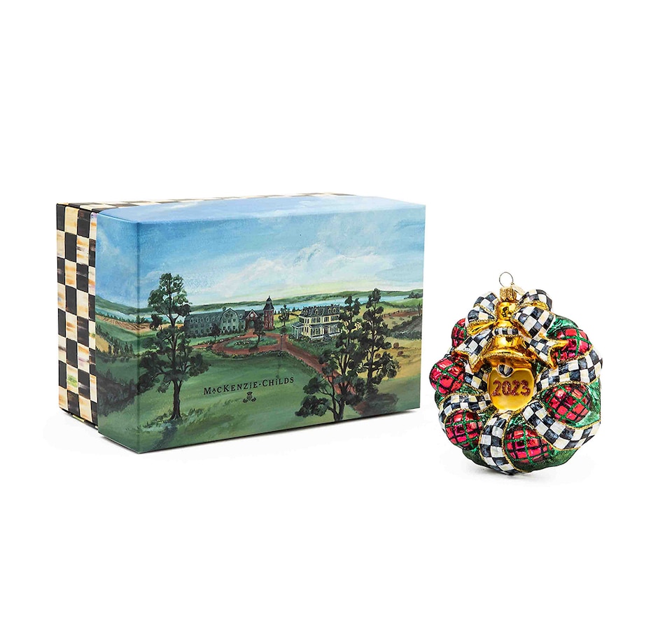Add to your memories year after year with MacKenzie Childs' collection of beautiful glass ornaments, including this 2023 dated wreath, decorated with red tartan baubles and a bow of courtly check. This ornament is mouth-blown and hand-painted in Eastern Europe by some of the world's most talented glass artisans, and is presented in a keepsake gift/storage box. Please note these pieces may vary due to the handmade nature of each product