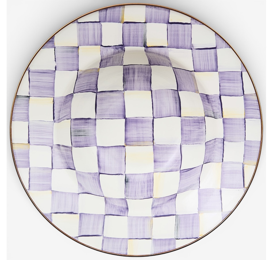 The heavy-gauge steel underbody is glazed with hand-painted, color-dragged checks in a range of blue hues that are similar in theme to the popular Courtly Check® and rimmed in bronzed stainless steel. Each piece reflects the artisan’s hand, so no two are exactly alike, although they all work together in perfect harmony.