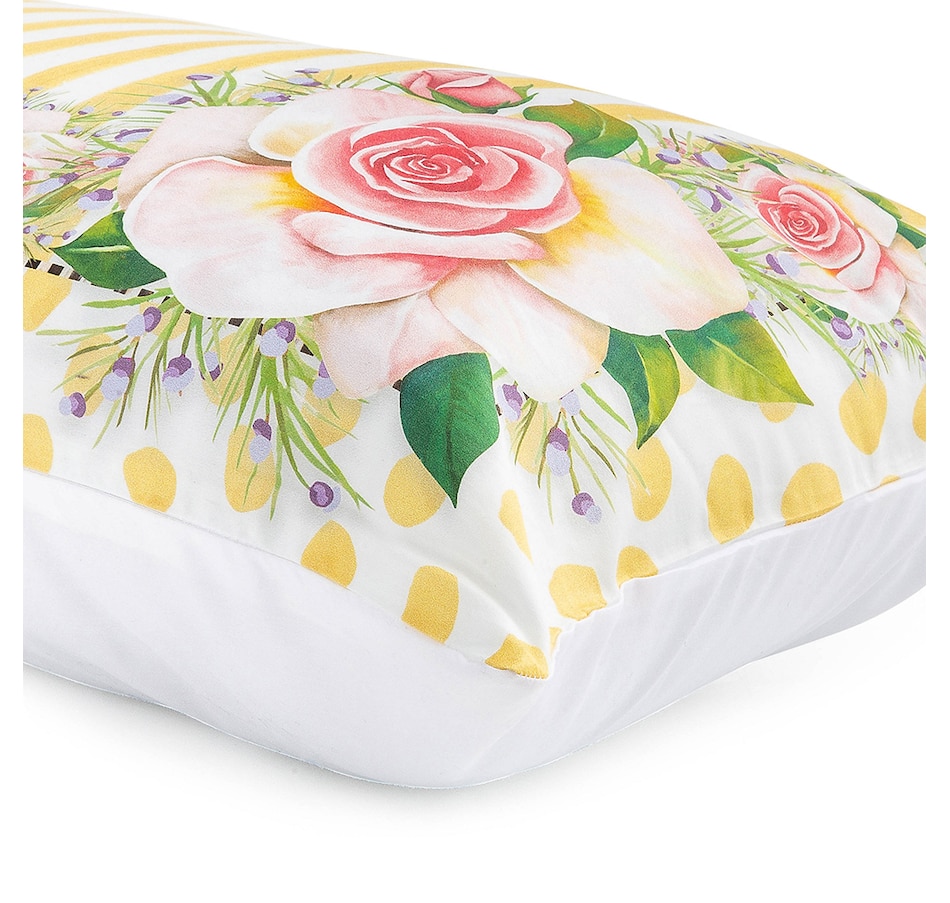 This floral lumbar pillow is always in bloom, and features printed wildflower pattern on a background of yellow splots and stripes.