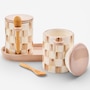 These ceramic Mocha Check Farmhouse Canisters from Mackenzie-Childs are perfect for storing kitchen staples. They feature hand-applied Mocha Check transfer decorations and have a handy small wooden spoon attached, making it convenient to dole out a dash of flour, sugar, coffee or whatever else you store inside!