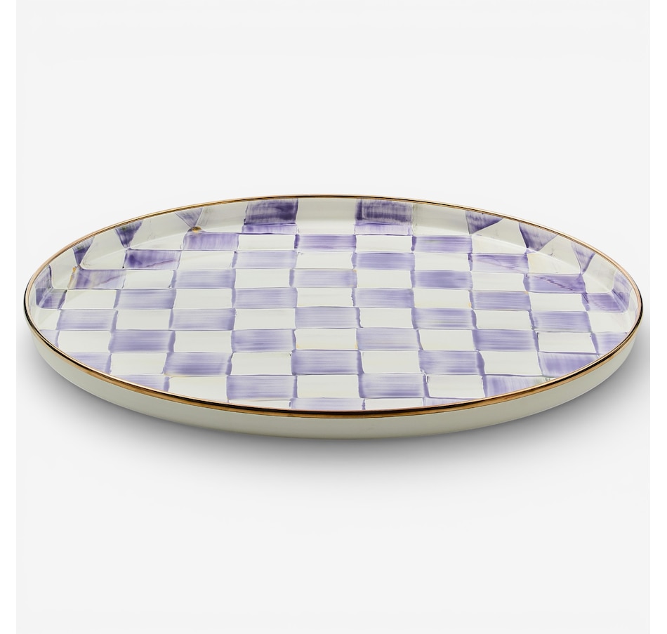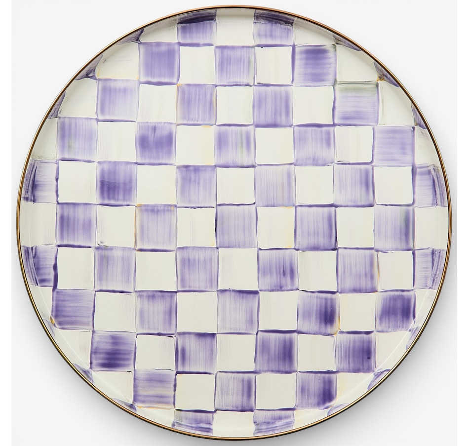 Add some style to your serving with this beautiful round tray from Mackenzie-Childs. It is made of heavy-gauge, hand-glazed steel with hand-applied decoration and a bronzed stainless steel rim.