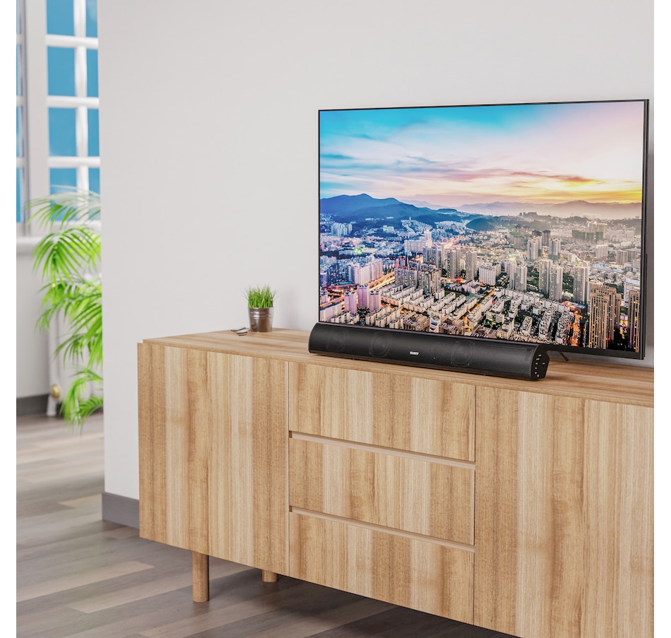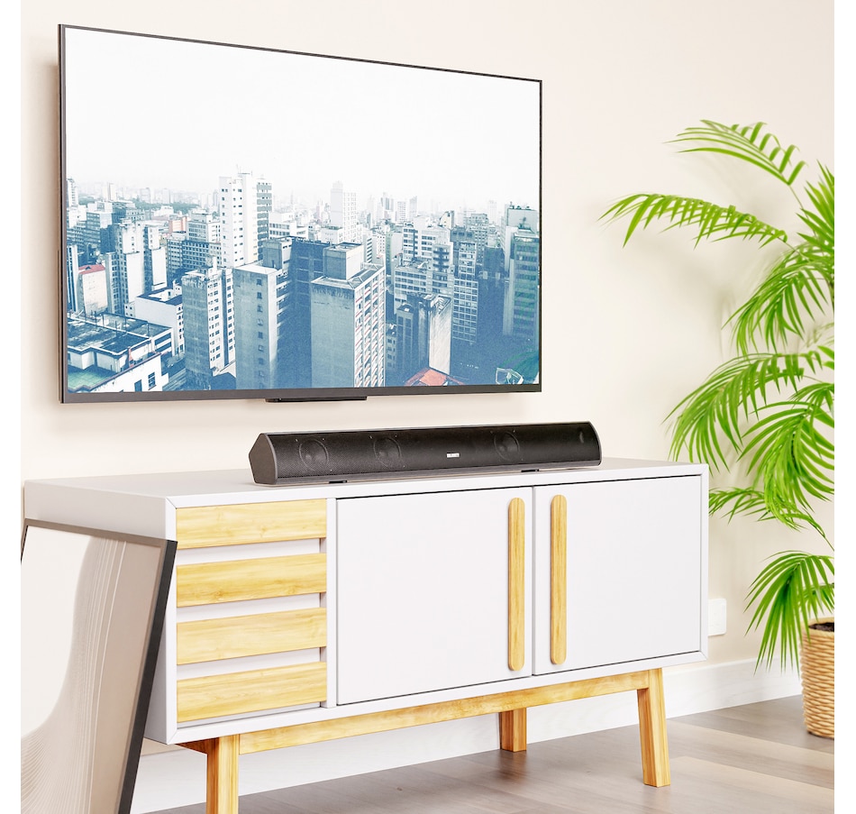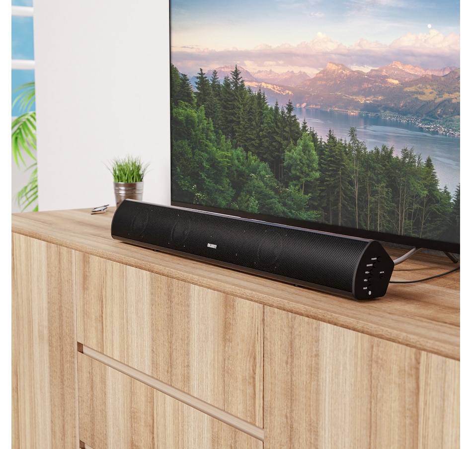 The Teton soundbar provides exceptional high-fidelity 180-watt sound quality and helps breathe life into movies, music and games with its dynamic EQ controls.