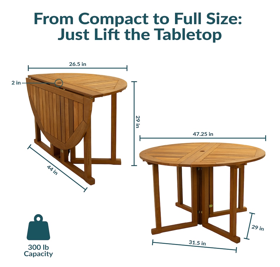 Make sure there is room for everyone when dining al fresco with this elegant Malaysian hardwood gateleg table. Its pivoting legs makes the tabletop easy to adjust to ensure there is plenty of table space for all. When the dropleaf tabletop is lowered, the table can seat up to 4 people comfortably around it. When one side of the dropleaf tabletop is raised, there is room for up to 2 people. Fold down one side to press the table against a wall for additional floor space. Fold down both sides when not in use for convenient storage. This sophisticated piece is constructed of stylish Malaysian hardwood for a sturdy design and classic beauty that will complement any patio decor. It also has a teak oil finish for added style and additional protection from the outdoor elements. This heavy-duty table weighs a sturdy 52.4 lbs and supports up to 300 lbs. Place this lovely table on the deck, patio, or in the backyard for family and friend gatherings.