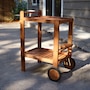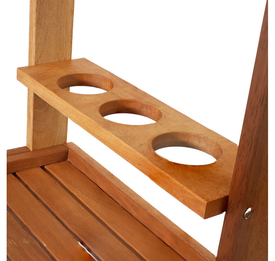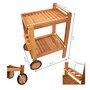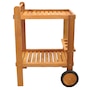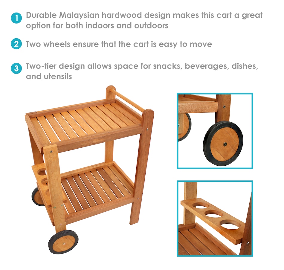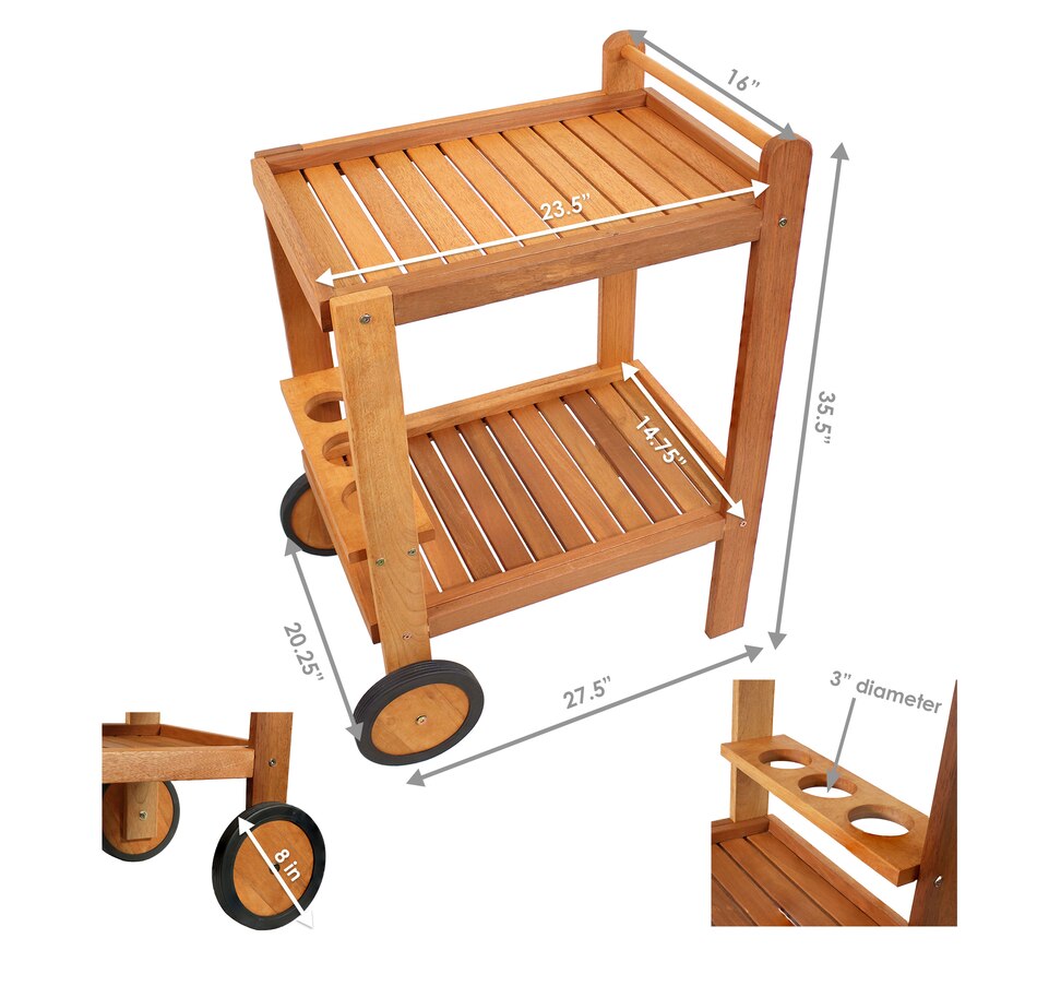 Serve up drinks and appetizers with this stylish beverage bar cart. Featuring two 8" diameter front wheels, this cart can be easily moved from place to place. This coffee serving cart is made from sturdy Malaysian hardwood with a protective teak oil finish so it can be used for indoor or outdoor use. Enjoy tasty meals on the patio or serve cocktails and wine at a dinner party. This drink trolley bar cart features a light wood construction and a classic design that is sure to complement any decor style. It features two tiers to provide plenty of space for food or drinks. It also features a convenient built-in bottle holder. It is capable of containing up to three 25 oz wine bottles. The top tier has a 20 lb weight capacity while the bottom tier has a 40 lb weight capacity. This trendy and practical cart is a wonderful addition to to the front porch, patio, dining room, or kitchen.