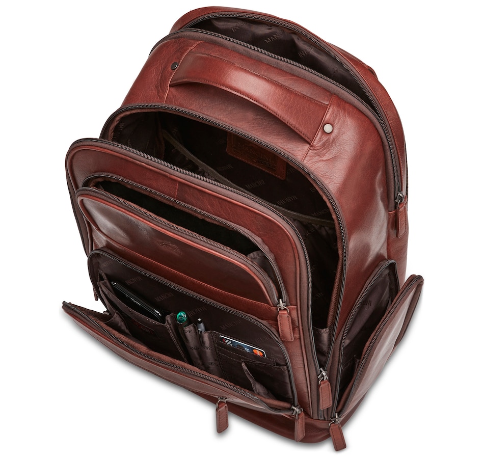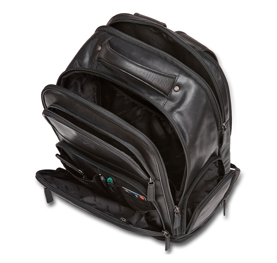 This backpack features a large main compartment as well as a zippered padded compartment. An organizer including an RFID secure pocket securely holds your personal belongings. A zippered side pocket, water bottle pocket as well as multiple front zippered pockets provide ample room for storage.