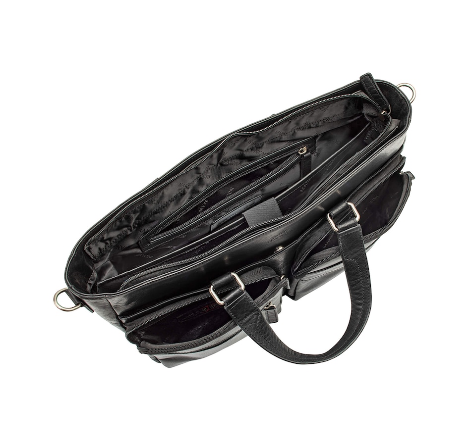 This laptop tote features a main compartment with a laptop padded sleeve to keep your device secure and protected, plus multiple practical zippered pockets and an RFID secure zippered pocket equipped with the latest RFID wave-blocking technology to ensure your data and cards are safe. The rear is equipped with a zippered pocket.