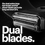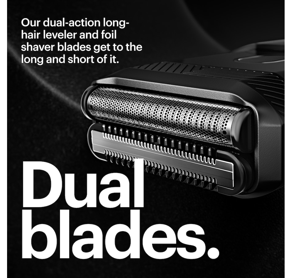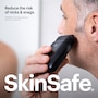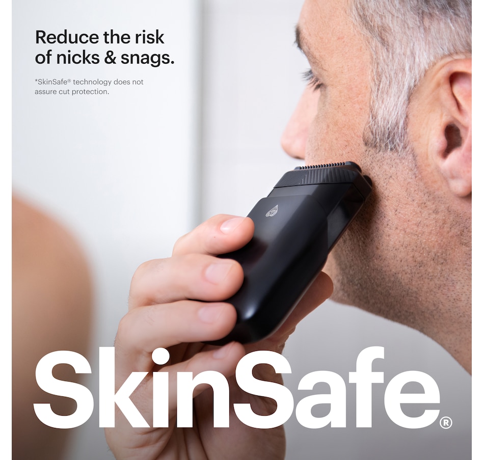- SkinSafe Technology with two-blade design features a long-hair leveller for trimming down long hair and a foil shaver for achieving a smooth finish (SkinSafe technology does not guarantee cut protection)