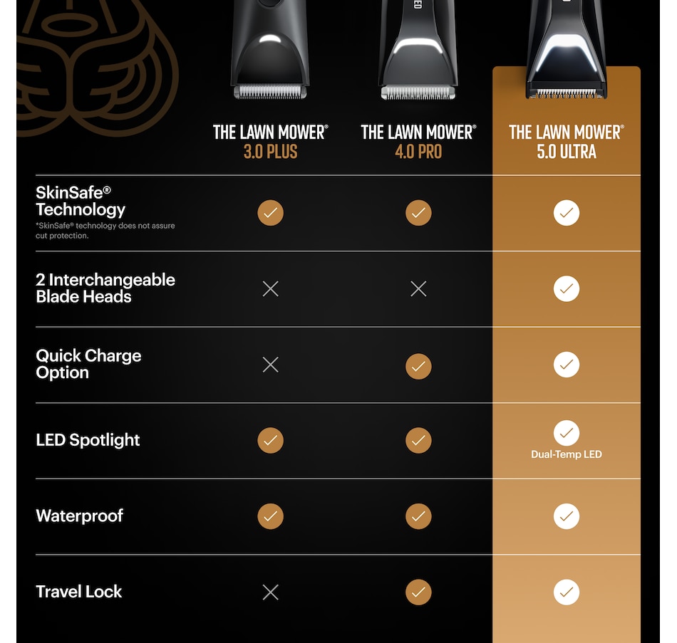 - Lawn Mower 5.0 features an advanced dual-head system and SkinSafe blades to provide enough power to shave, trim, and shape to your preference
