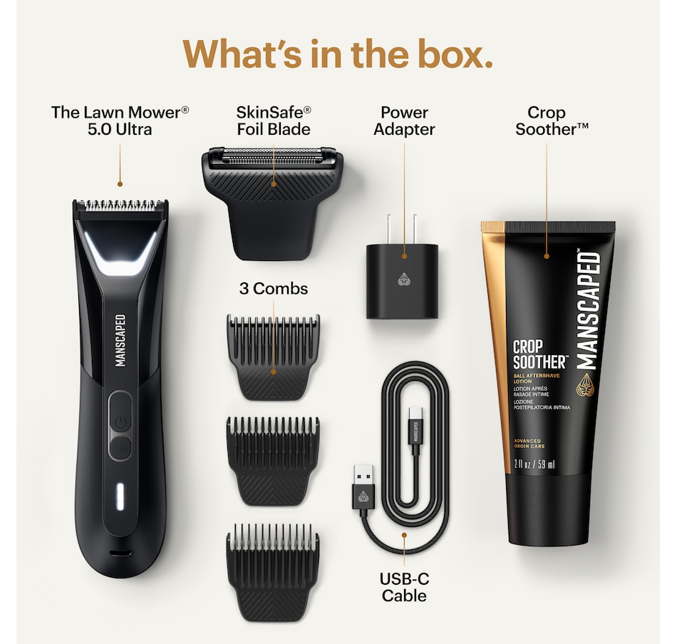 - Kit includes the Lawn Mower 5.0 Ultra device, Crop Soother groin aftershave, one SkinSafe trimmer blade, one SkinSafe foil blade, two blade guards, charger, adapter, instruction manual, and cleaning brush