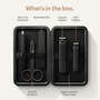 Enhance your hygiene and flawless look with the Manscaped Shears 3.0 Luxury Precision Men's Nail Grooming Kit. This five-piece kit includes a nail clipper, toenail clipper, steel nail file, slant-tip tweezers, cuticle scissors, and a vegan leather travel case. The durable plastic case helps to keep tools together, and the leather interior with elastic straps keeps the items in place.