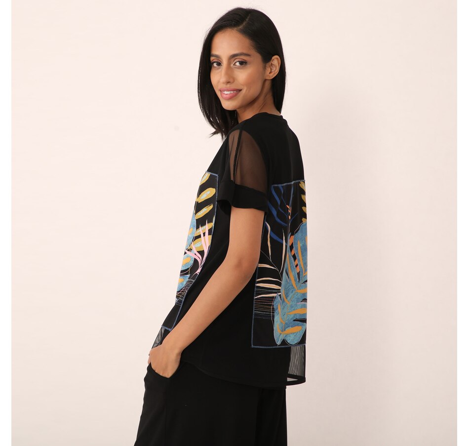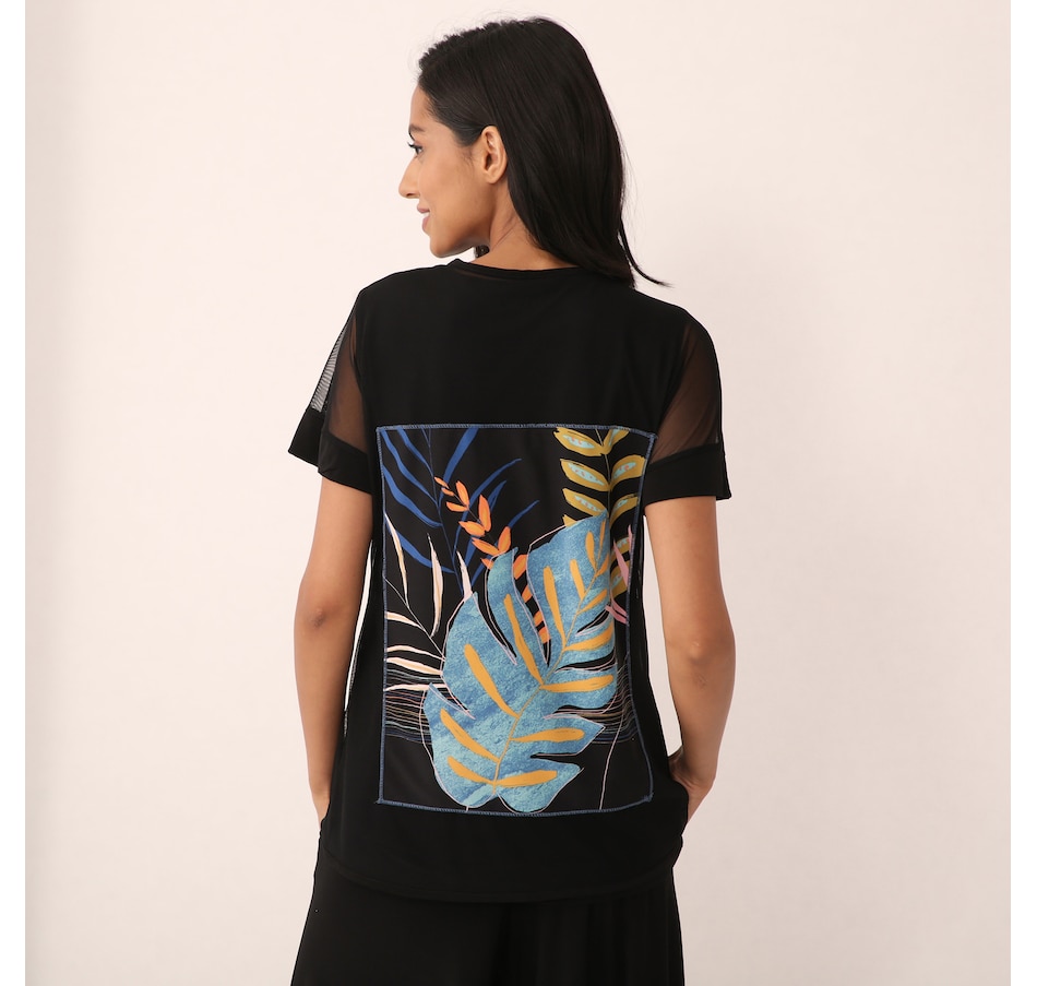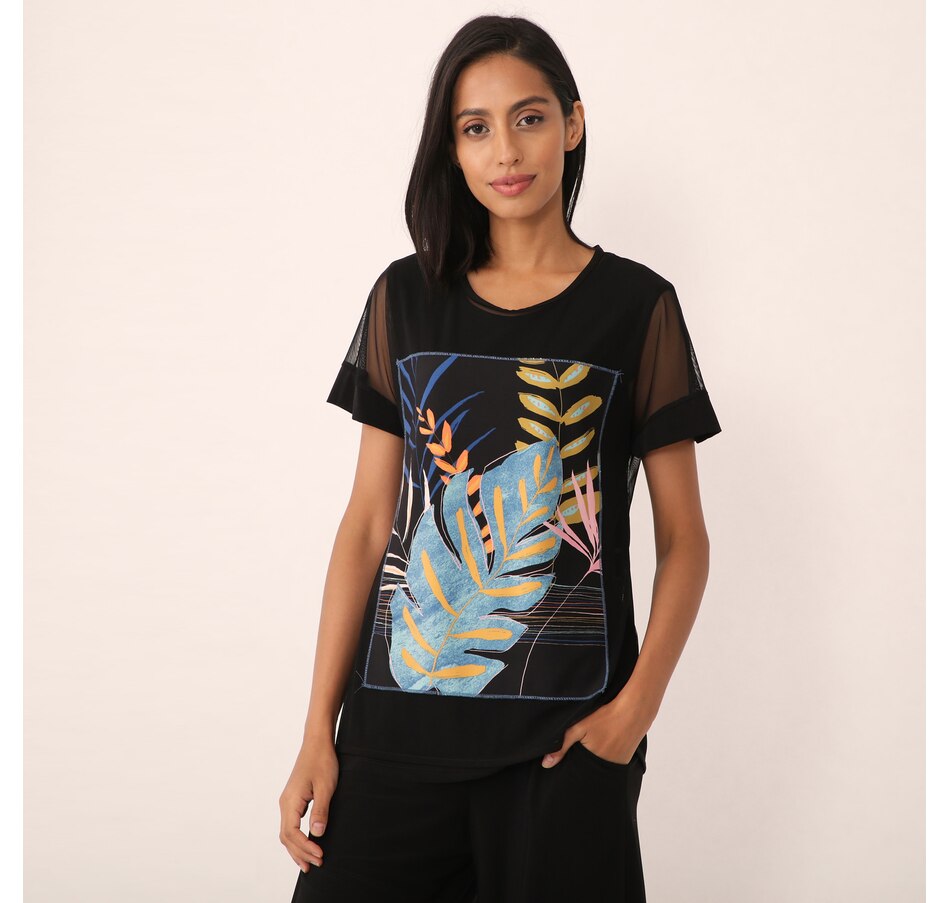 A two-for-one special, this fashionable mesh top is sold with a classic black cami to wear together or separately! This mesh top is designed with a pop of tropical print at the front for style and comfortable coverage. It's a true style wonder by Marallis.