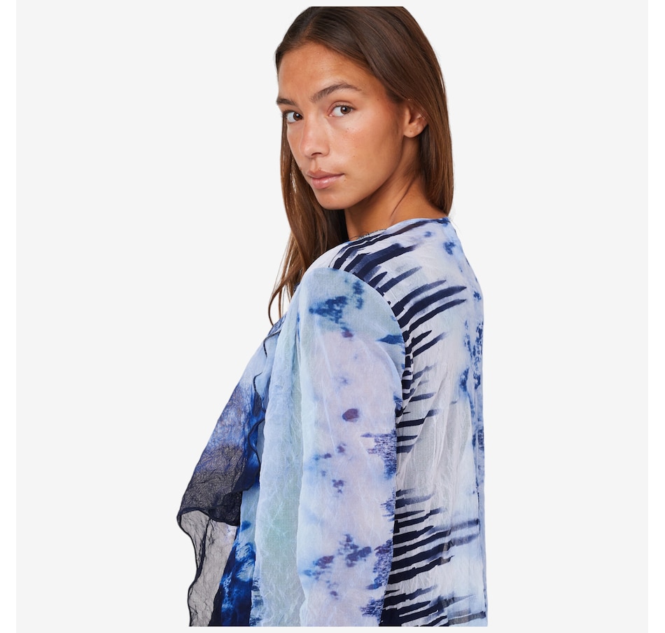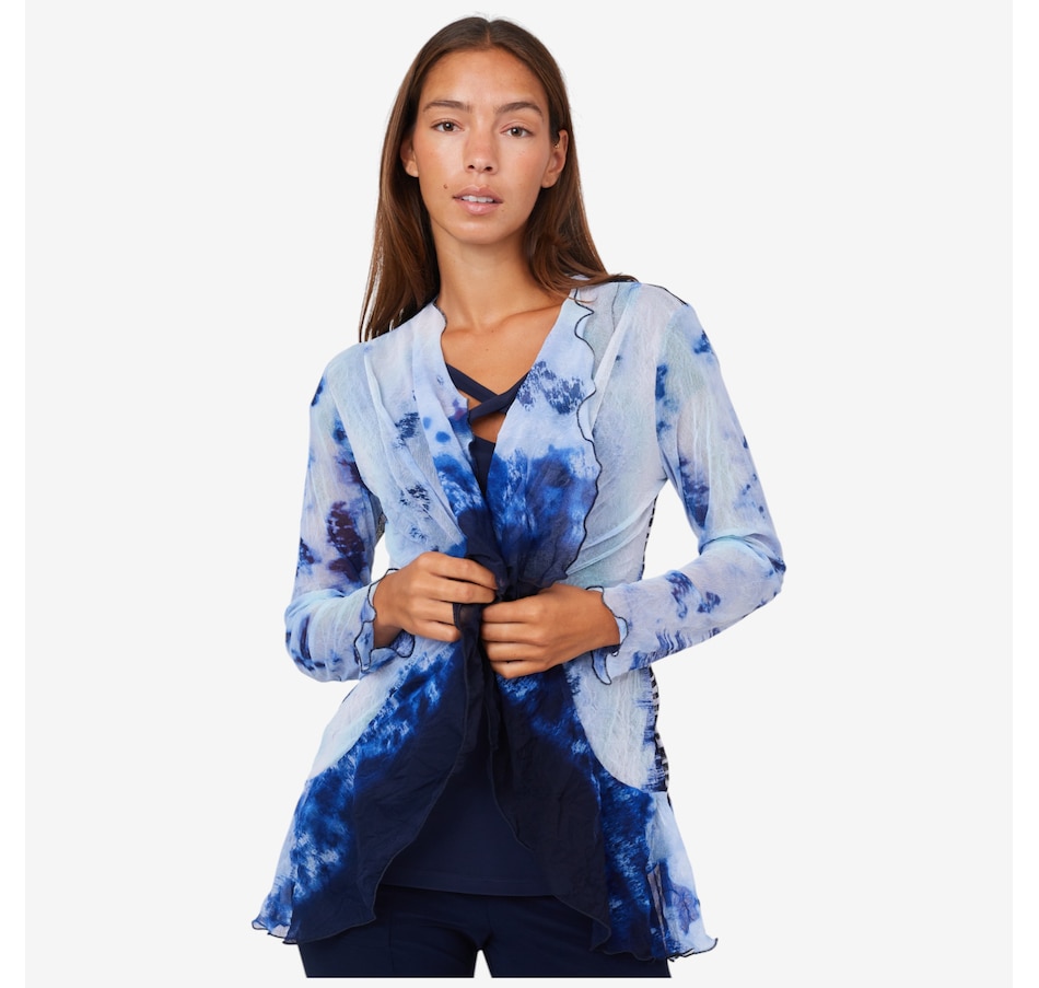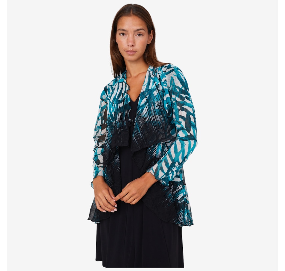 This crinkle mesh border print jacket from Marallis is a standout piece, made for effortless pairing over denim or your favourite wide-leg trousers. It wears beautifully in combination with any Marallis Classic Solid item too. This feminine and refined finishing piece features a fluid silhouette, and every print is unique with own different personality.