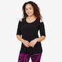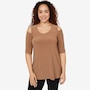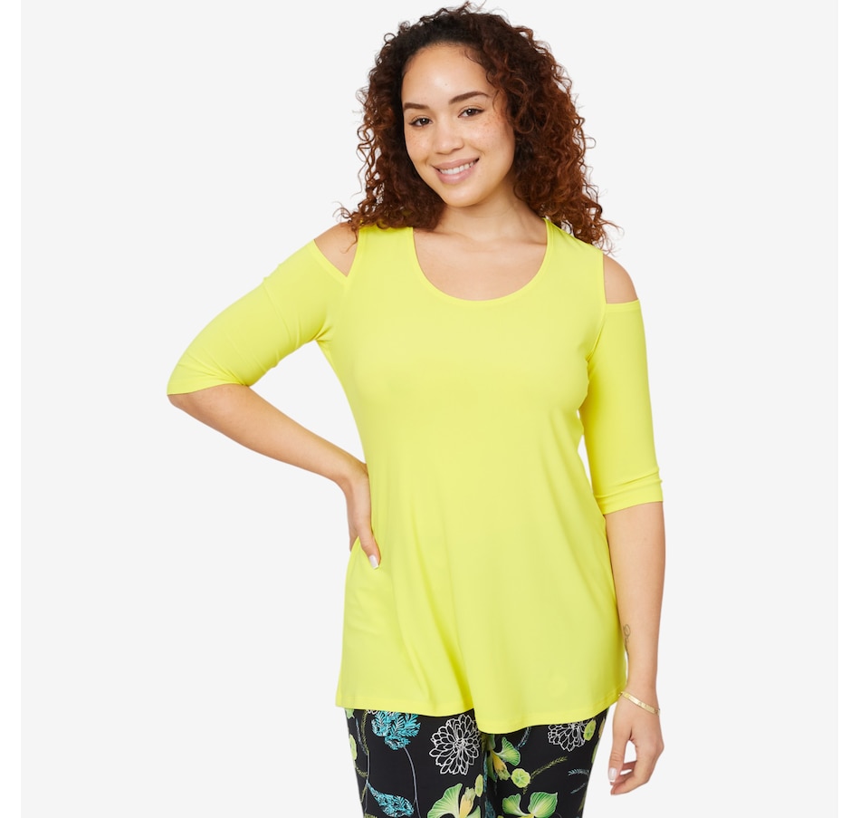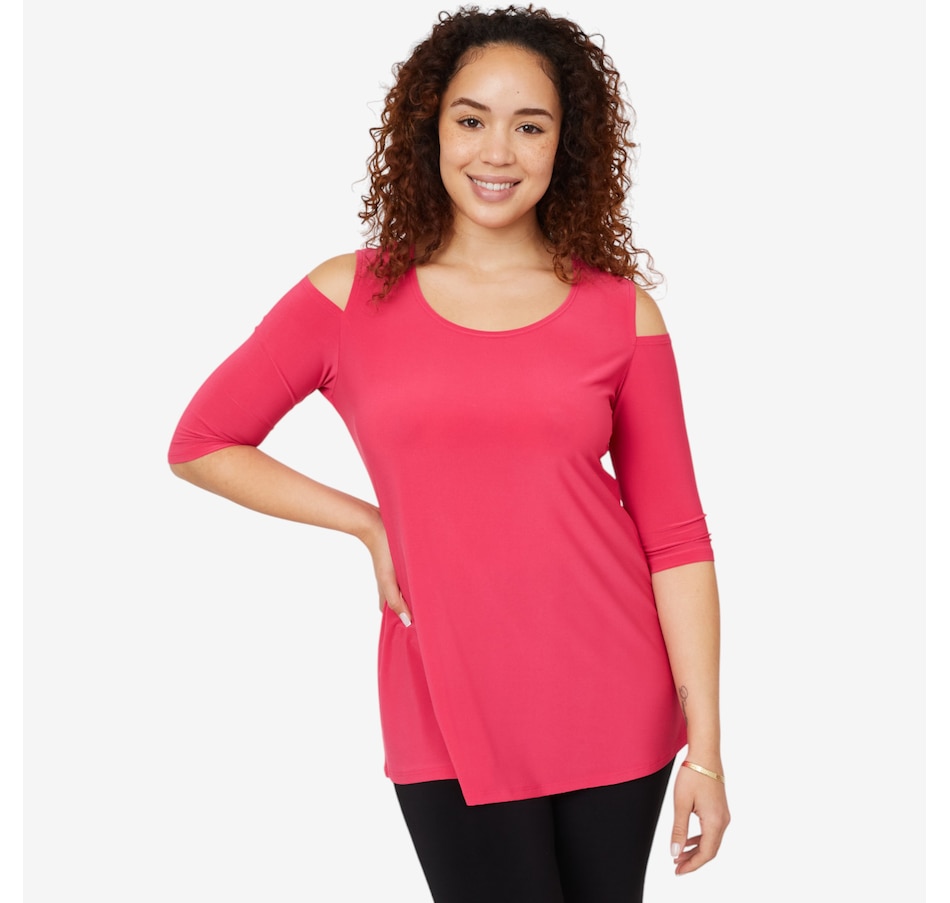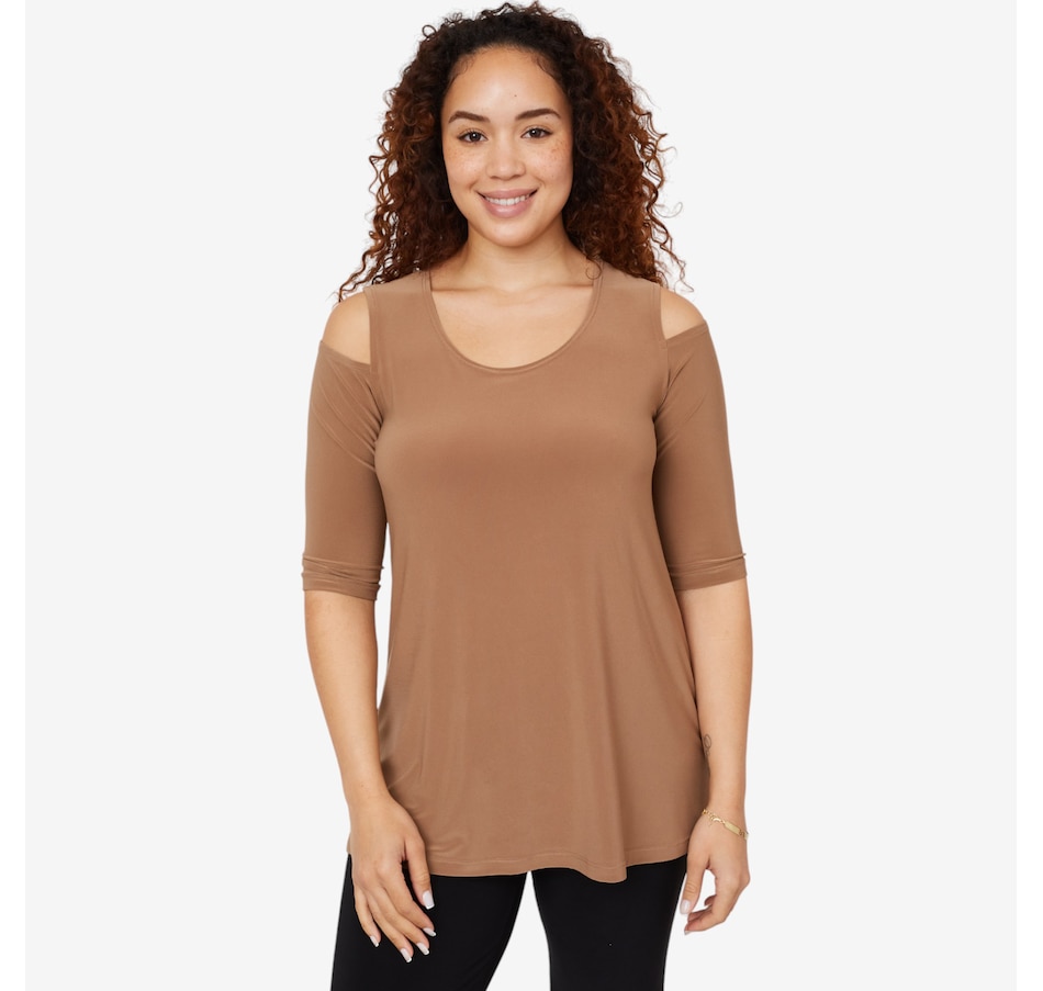 This may very well become your favourite cold shoulder t-shirt this summer! Reach for this flare-fit top that offers rear coverage when you want to balance revealing and reserved. Open cold shoulders and a scoop neckline show peeks of skin, while the flare silhouette can be styled to go anywhere.