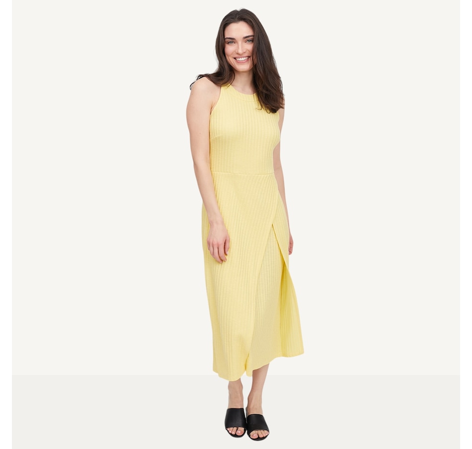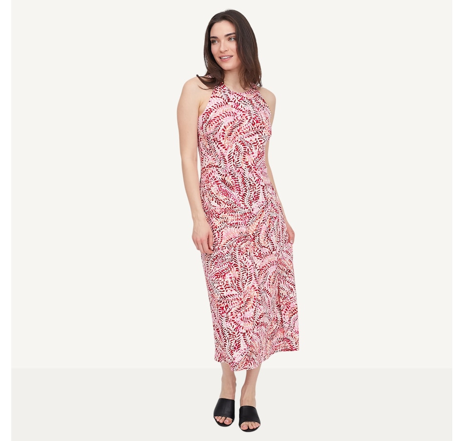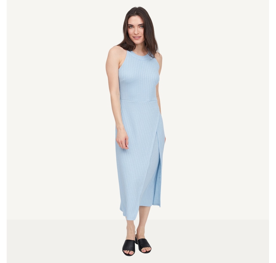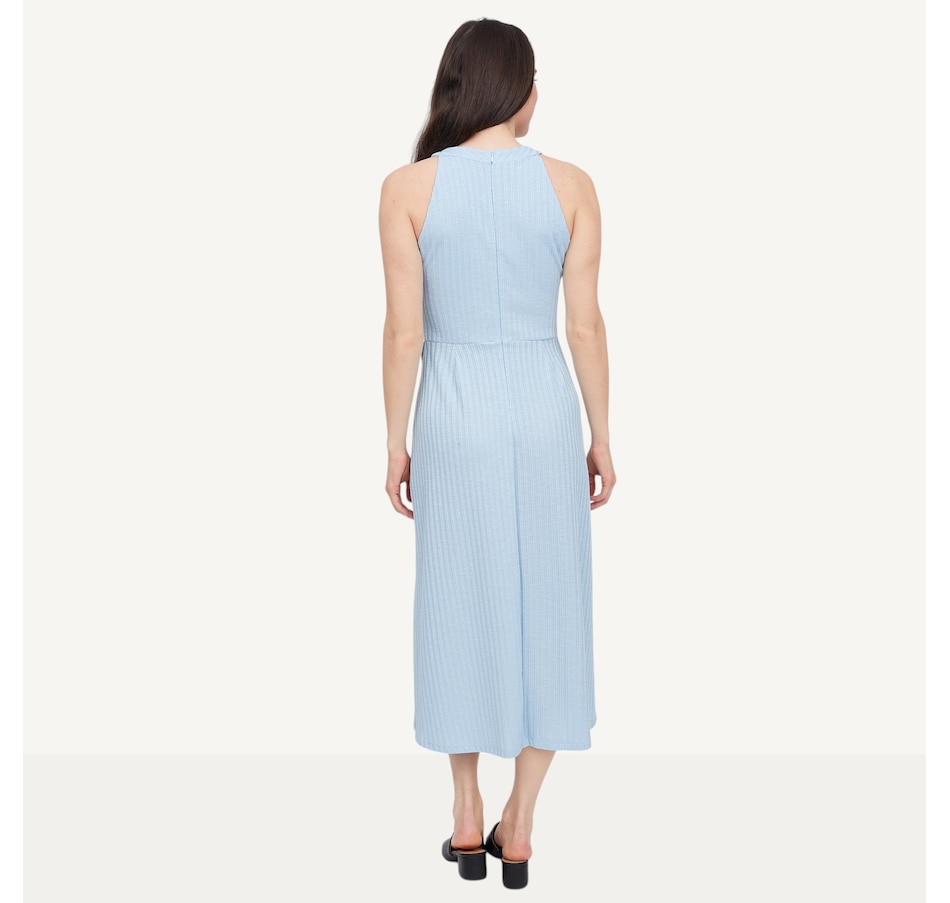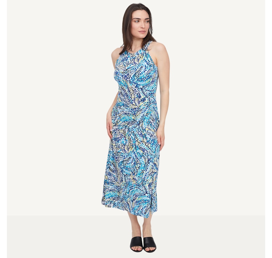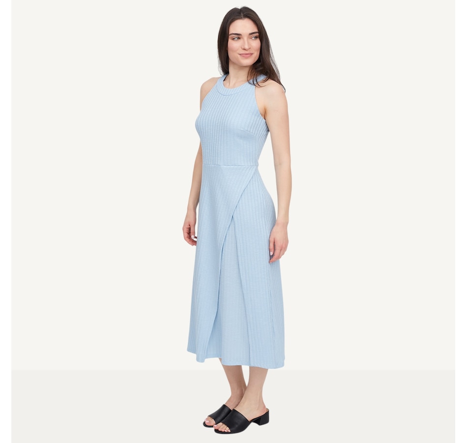 Step into sophistication with the Hacci halter dress with an asymmetrical skirt from Marallis, featuring a refined architectural silhouette and fluid movement. This dress features a high halter neckline and a sleek, fitted bodice that transitions into a dramatic asymmetrical wrap‑style skirt. A diagonal seam adds a contemporary edge and enhances movement, while the sleeveless design keeps the look clean and streamlined. Finished with a serged hem and a back zipper, this semi‑fitted style measures 44" from the centre back. Exclusive to TSC, it is designed and produced in Canada.