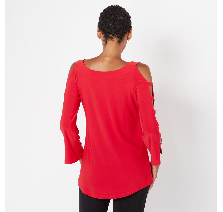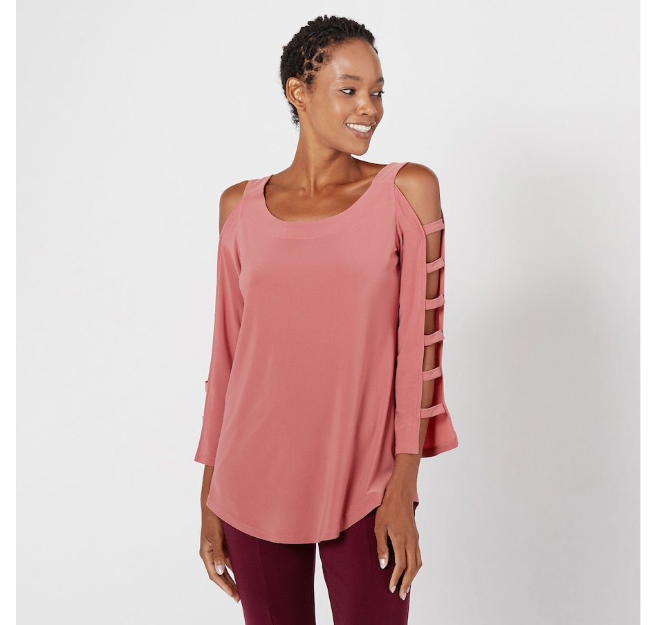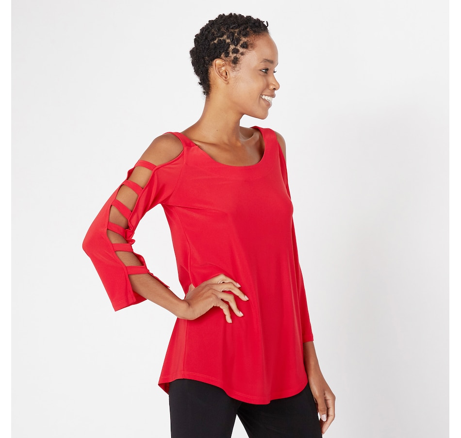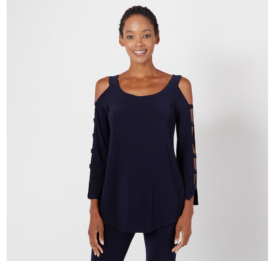 The designer-style is in all the detail with this ladder sleeve top from Marallis! It is bra-friendly, designed in a tunic length, and made with stretch knit fabric. This top is proudly designed and sewn in Canada.