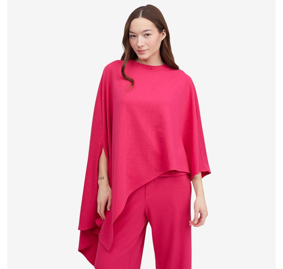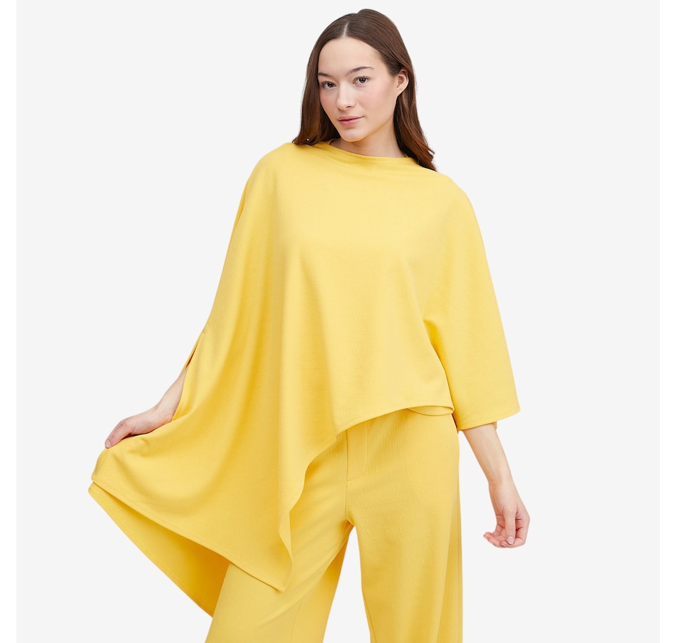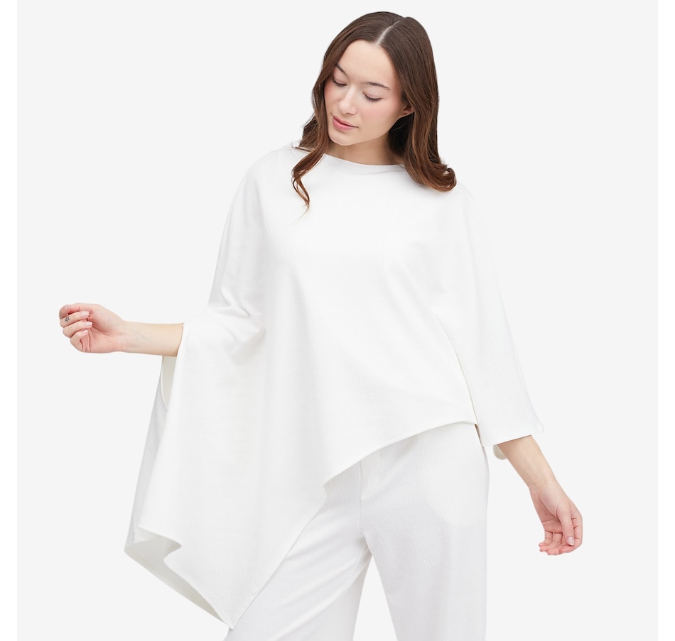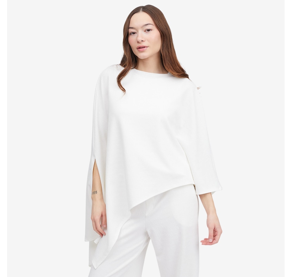 An effortless layering piece designed to complete the look, the linen jacquard asymmetrical shawl from Marallis features long sleeves and a soft asymmetrical drape on one side for added movement and style. Lightweight and easy to slip on, it offers extra coverage without weighing you down. Designed to match the coordinating tank top and wide‑leg pants, this unlined style features a boat neckline and a serged hem. Designed and produced in Canada, it is available in five versatile colours and offered in a one‑size, oversized fit. Available only at TSC.