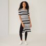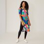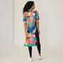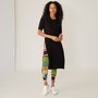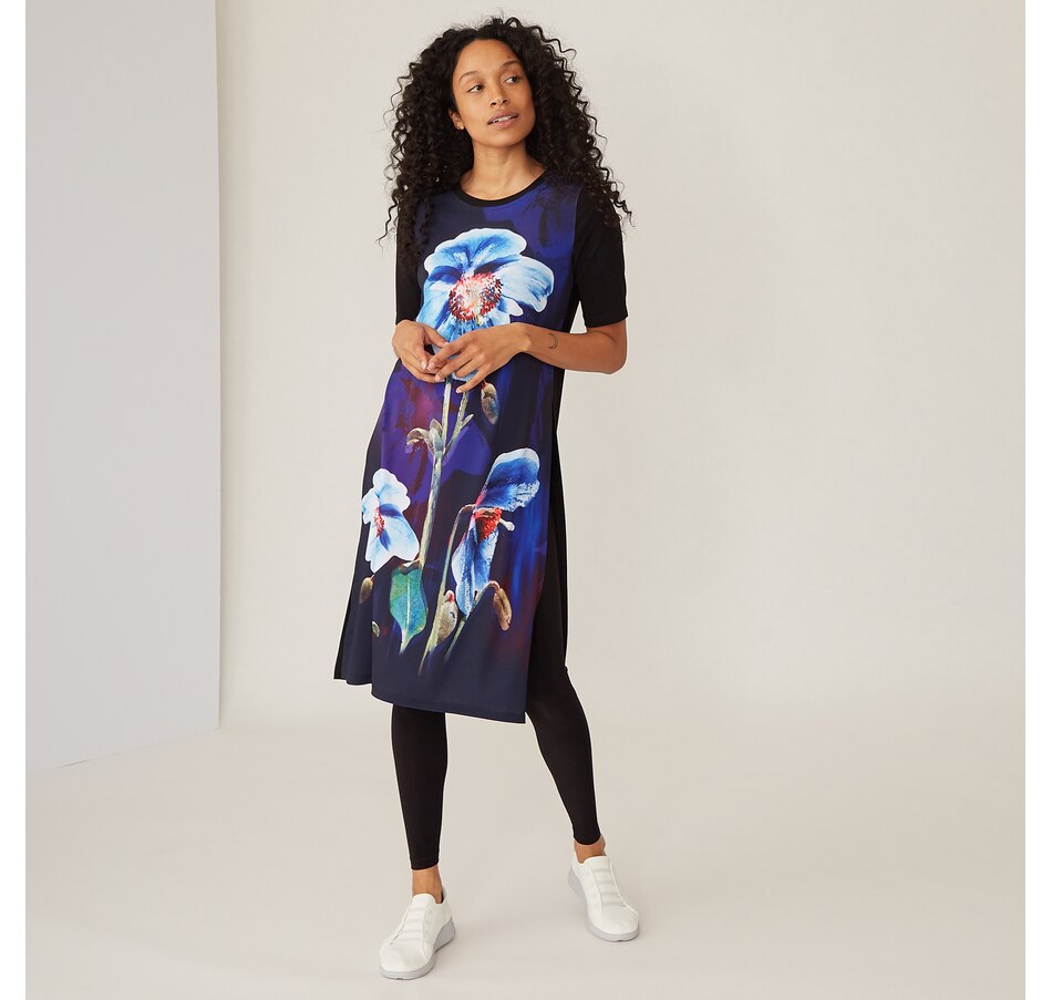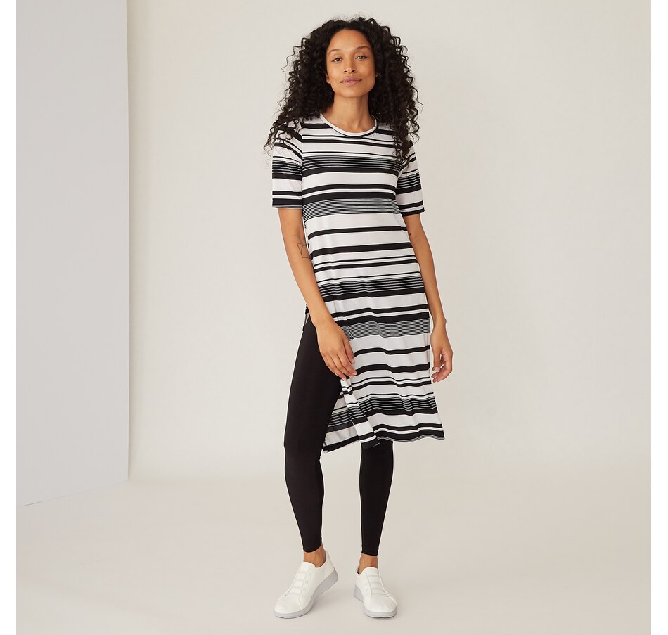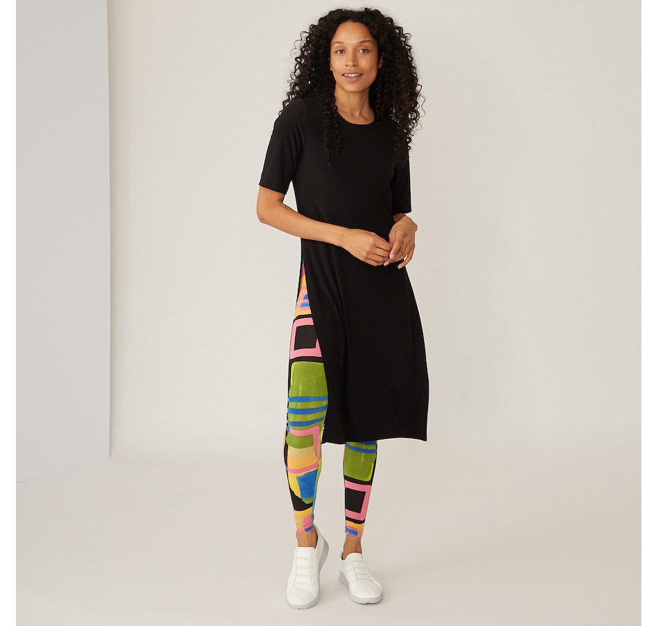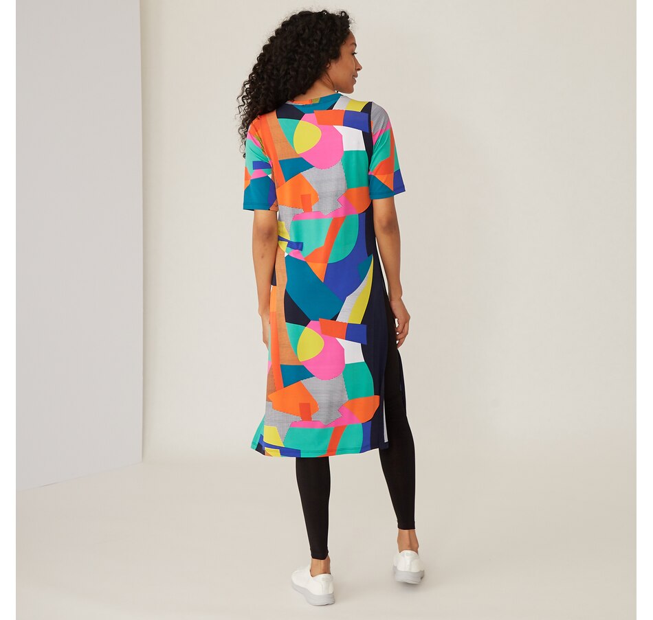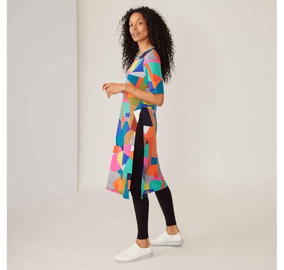 • Straight silhouette with high side slits (25") just slightly below the waistline; high round neck; short sleeves, 42" in length