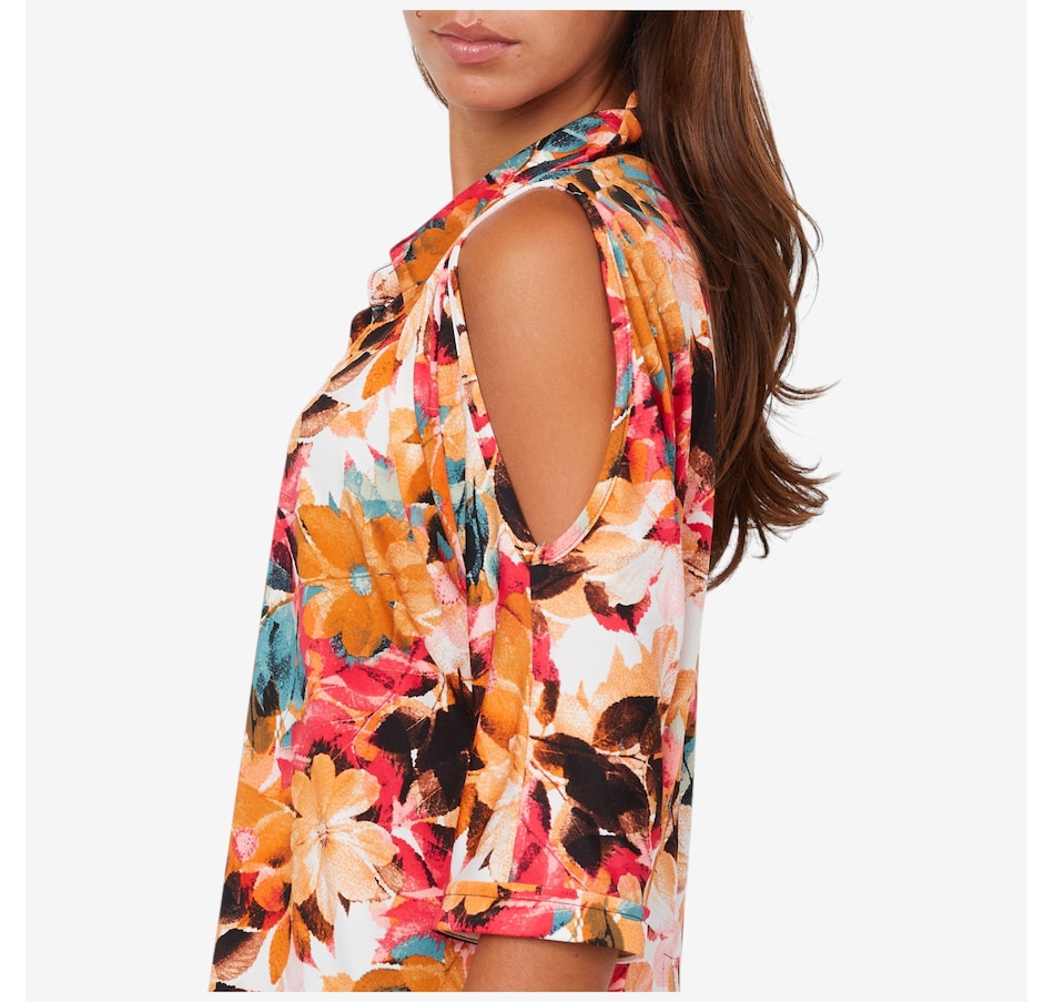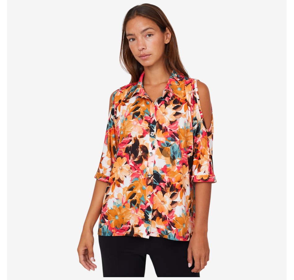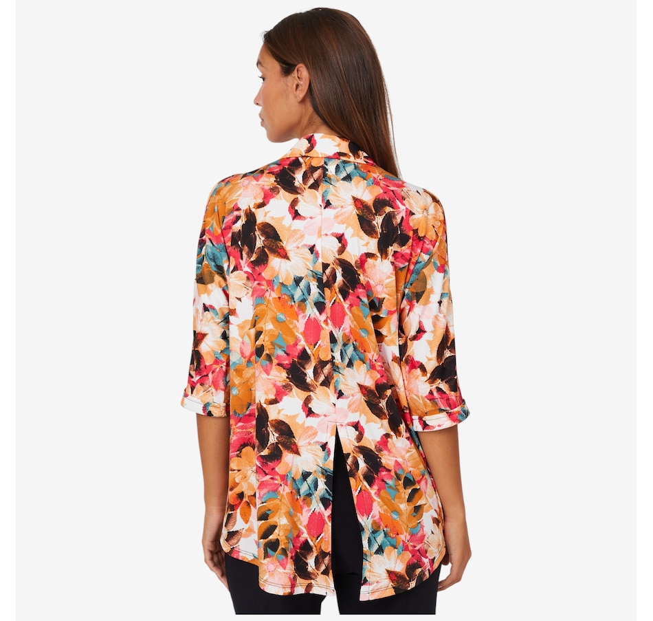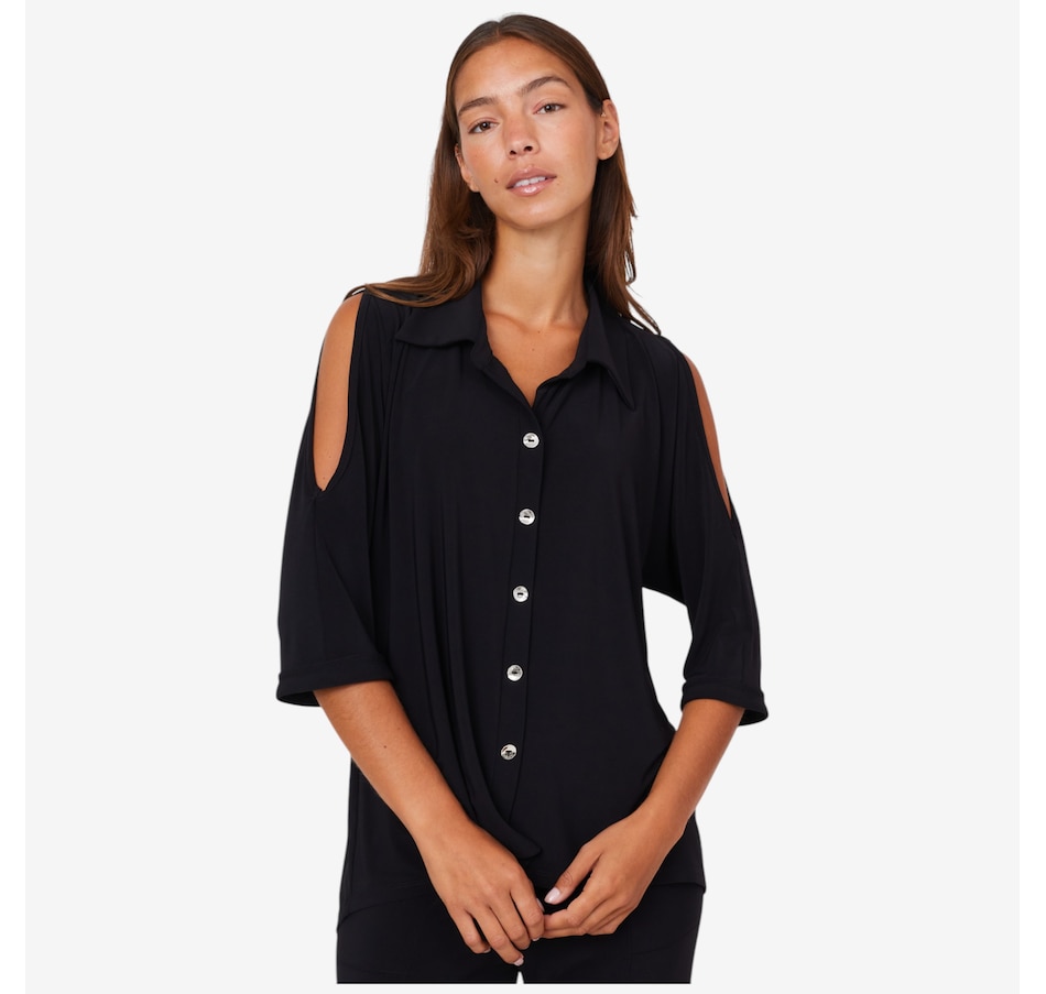 • Button-front faux closure, peek-a-boo detailing, 3/4 sleeves with cuffs, shirt collar, back centre slit, high-low hemline