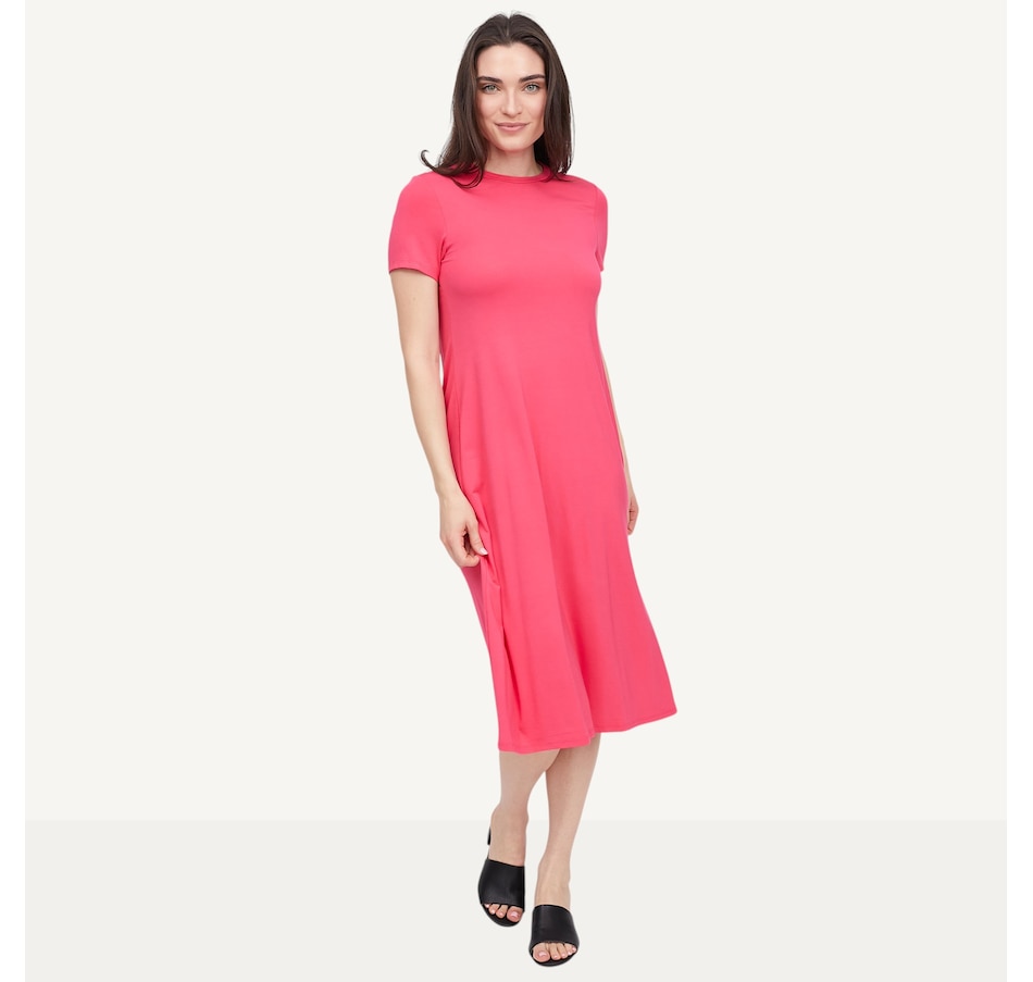 This rayon jersey crewneck midi t‑shirt dress from Marallis is designed for easy, everyday wear with a timeless, laid‑back look. Featuring a classic crew neckline and short sleeves, it is cut in a flattering a‑line silhouette that drapes comfortably to a midi length. Crafted from soft, breathable rayon jersey, this unlined style offers all‑day comfort with a smooth, lightweight feel. Finished with a serged hem, it measures 32" from the centre back. This dress is exclusive to TSC and designed and produced in Canada.