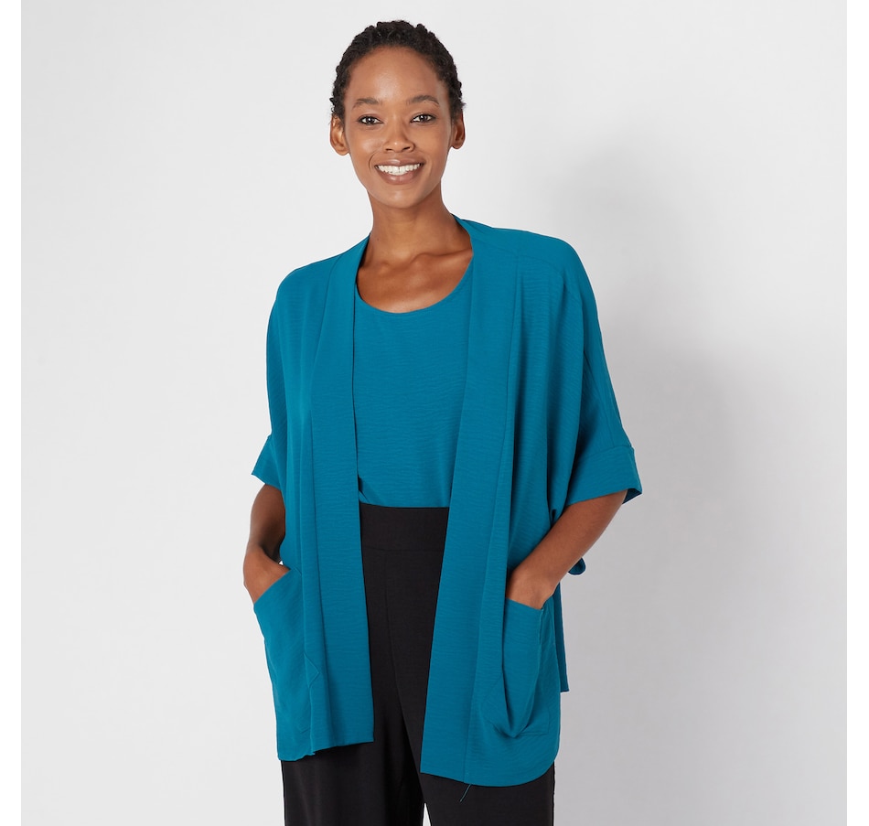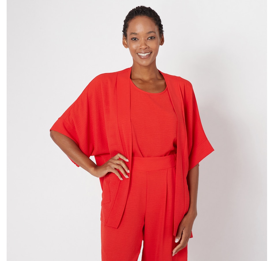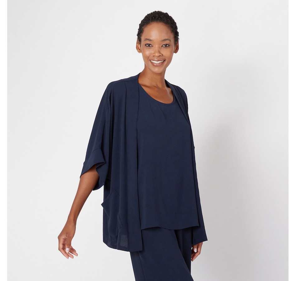 A true essential, this crepe jacket from Marallis is lightweight and fashionable, all wrapped into one! Perfect for layering at home or when out-and-about, its lightweight air-flow fabric is easy to carry or roll up and pack. It features two front placed pockets and kimono sleeves with a faux-cuff detail. This piece is proudly designed and sewn in Canada.