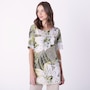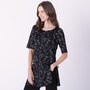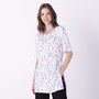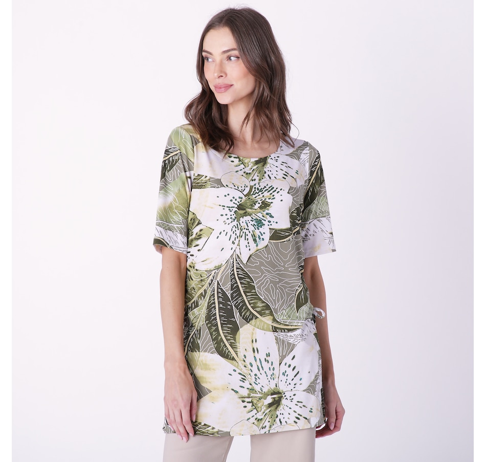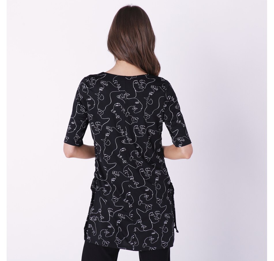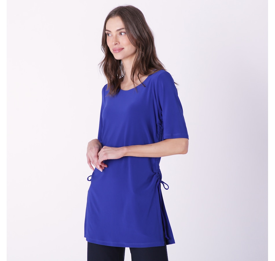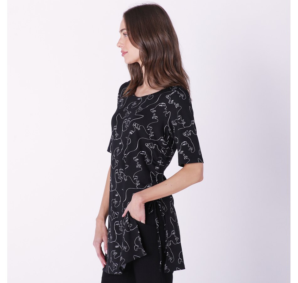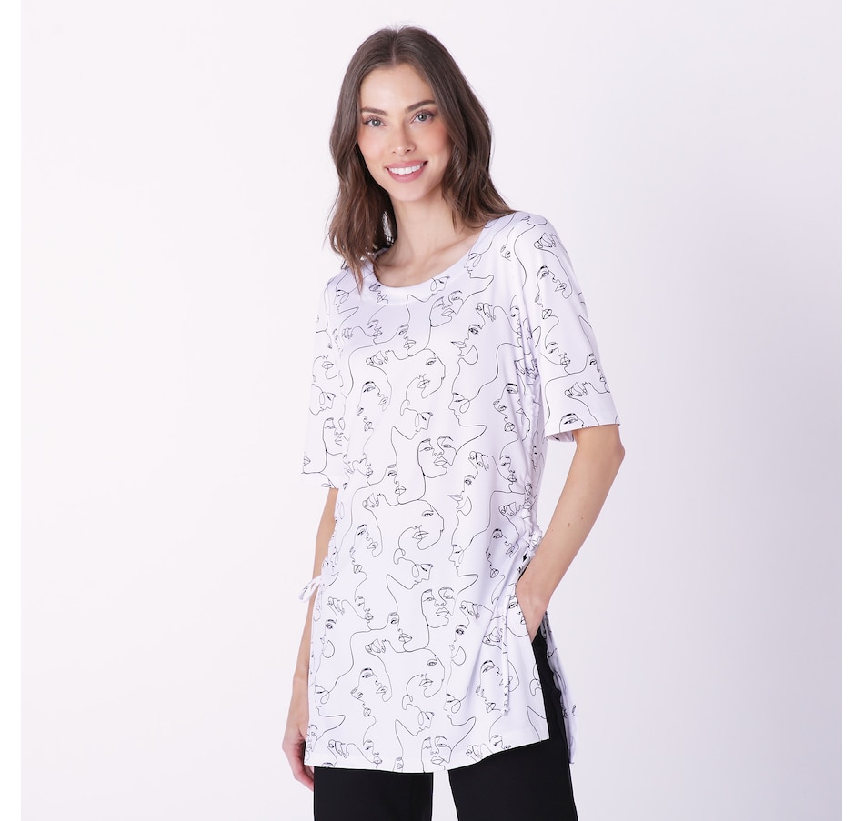 At first glance, it's a simple tee, but with a twist of the hips it's a fun fashion-forward piece! It features side functional drawstring details that can be worn open or with bows, and is made from stretch, brazil knit fabric in a variety of stylish prints.
