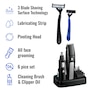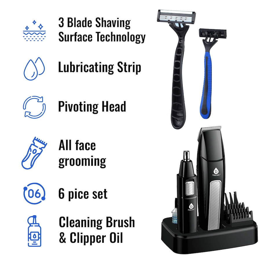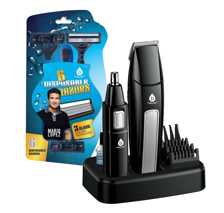 Upgrade your grooming routine with the ultimate men's grooming bundle featuring the Mario Lopez Men's Grooming Kit and Mario Lopez Disposable Razors. Designed for precision and versatility, this comprehensive set offers everything you need for hair, beard, nose, and ear grooming, plus the convenience of high-quality disposable razors for an effortless shaving experience.Mario Lopez Men's Grooming Kit: This 10-piece kit provides professional-grade grooming tools tailored to meet all your grooming needs. Whether trimming your hair, beard, or dealing with unwanted nose and ear hair, this set guarantees precision and convenience.Stainless Steel Precision Clipper: A durable clipper designed for consistent results.Adjustable Guide Combs: Achieve the perfect length and style with four customizable guide combs.Ear, Nose, and Brow Trimmer: Remove unwanted hair safely and comfortably.Cleaning Brush & Clipper Oil: Keep your tools in top shape with these included accessories.Mario Lopez Disposable Razors: Elevate your shaving routine with advanced 3-blade shaving surface technology. These razors are designed to provide a smooth and close shave while minimizing irritation, making them perfect for daily use or travel.3 Blade Shaving Surface Technology: Ensures an exceptionally close shave.Rubberized Handle: Offers superior grip and control, even when wet.Pivoting Head: Adapts to your facial contours for a safer shave.Lubricating Strip: Enhances glide and reduces friction for comfort.This bundle is perfect for achieving a fresh, polished look every day. Whether for grooming at home or while traveling, the Mario Lopez Men's Grooming Kit and Disposable Razors have you covered.