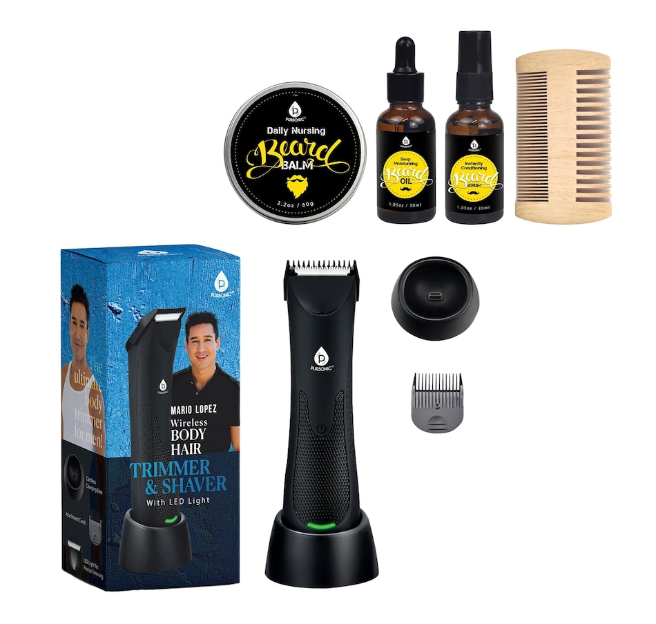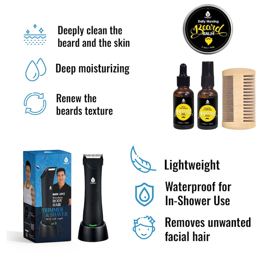 Elevate your grooming routine with the Mario Lopez Wireless Body Hair Trimmer & Shaver and Beard Care Grooming Kit Bundle. This comprehensive set offers the ultimate grooming experience for men who prioritize style, precision, and sophistication.1. Mario Lopez Wireless Body Hair Trimmer & Shaver: Experience the epitome of grooming excellence with the Mario Lopez Wireless Body Hair Trimmer & Shaver. This advanced grooming tool boasts cutting-edge features designed to deliver impeccable results with every use.Key Features:Cordless Charging Base: Enjoy the convenience of a cordless trimmer with the included charging base, ensuring your trimmer is always ready for action.LED Light for Precise Trimming: Achieve unparalleled precision with the built-in LED light, providing enhanced visibility for precise grooming.Precision Ceramic Blade: Glide effortlessly through thick and coarse body hair with the precision ceramic blade, ensuring a smooth and comfortable grooming experience.Waterproof Design: Use your trimmer in the shower with confidence, thanks to its waterproof design for hassle-free cleanup.Attachment Comb & USB Cord: Customize your grooming experience with the included attachment comb and charge your trimmer anywhere with the USB cord.2. Beard Care Grooming Kit: Treat your beard to the care it deserves with our unique 4-piece grooming kit, designed to enhance and maintain your facial hair with style and sophistication.Key Features:Set Includes: Beard Comb, Beard Oil, Beard Balm, and Beard Serum.Beard Oil (30ml): Deeply moisturize and nourish your beard with a blend of Vitamin E essences and golden jojoba oil.Beard Balm (60g): Firm and shape your beard while keeping it shining for the long term.Beard Serum (30ml): Deeply cleanses and hydrates your beard and skin, reducing oiliness and preventing dryness and itching.With the Mario Lopez Wireless Body Hair Trimmer & Shaver and Beard Care Grooming Kit Bundle, you can achieve the perfect grooming results from head to toe. Embrace precision, sophistication, and style with Mario Lopez.