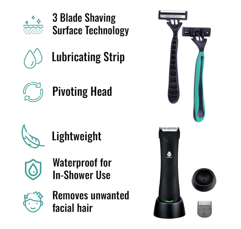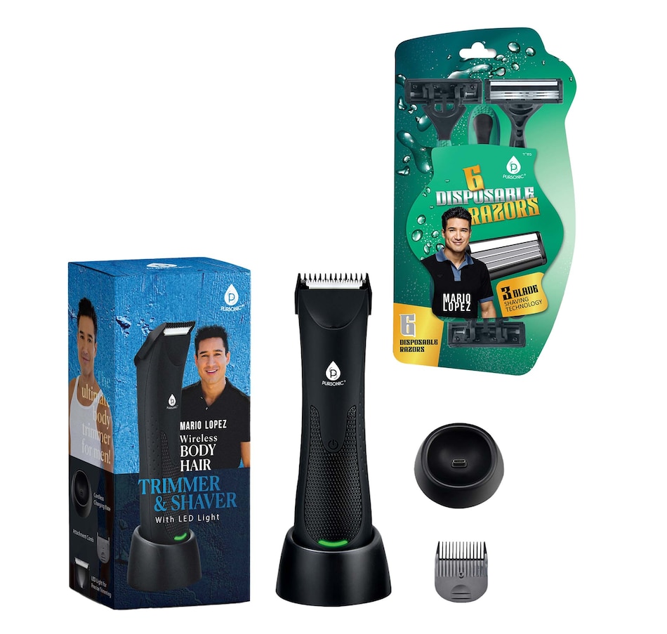 Pursonic - Mario Lopez Wireless Body Hair Trimmer & ShaverStay groomed with the Mario Lopez Body Hair Trimmer & Shaver, a versatile tool designed for precision and comfort.Cordless Charging Base: Keep your trimmer powered and ready with a wireless charging base—no more battery worries.LED Light: Trim with accuracy, even in low light, thanks to the built-in LED.Ceramic Blade: The precision ceramic blade ensures a smooth trim, even on coarse hair.Waterproof: Use it in the shower for easy cleaning and versatile wet or dry trimming.Attachment Comb & USB Cord: Customize your trim with the comb attachment and charge easily with a USB cord, perfect for travel. Mario Lopez Disposable Razors (3 Blade Shaving Technology)Achieve a smooth, close shave with Mario Lopez’s Disposable Razors.3 Blade Technology: Three precision blades provide a close shave with minimal irritation.Rubberized Handle: Designed for comfort and control, even when wet.Pivoting Head: Adapts to the curves of your face and body for a safer, smoother shave.Lubricating Strip: Infused with soothing ingredients for added comfort. This bundle offers the perfect combination of precision and convenience. Keep your grooming sharp and effortless with the Mario Lopez Body Hair Trimmer & Shaver and Disposable Razors set!