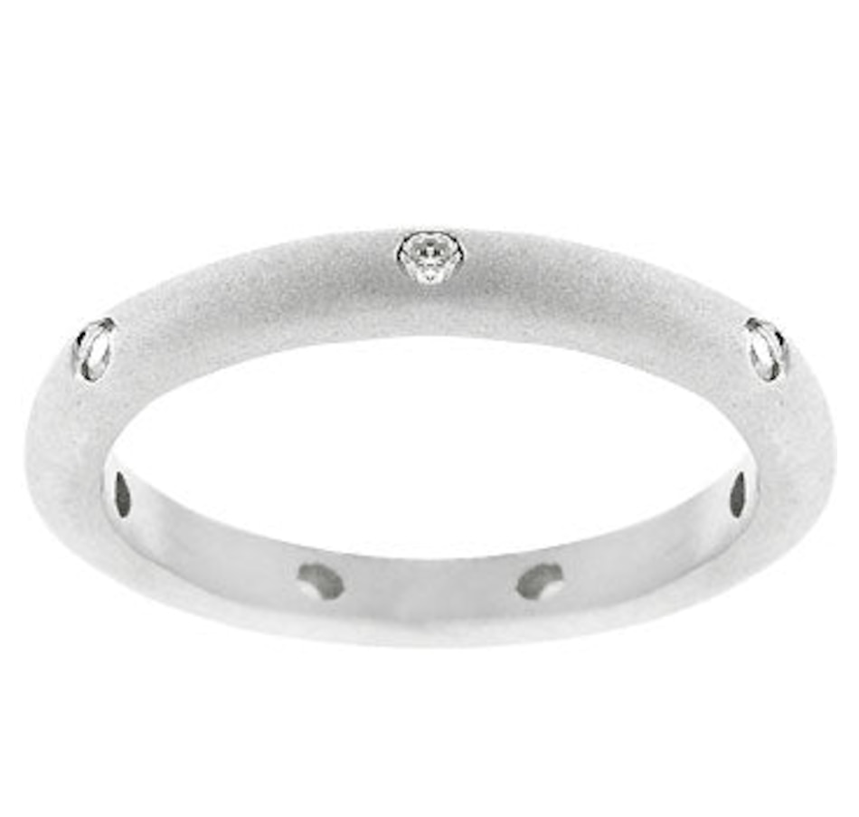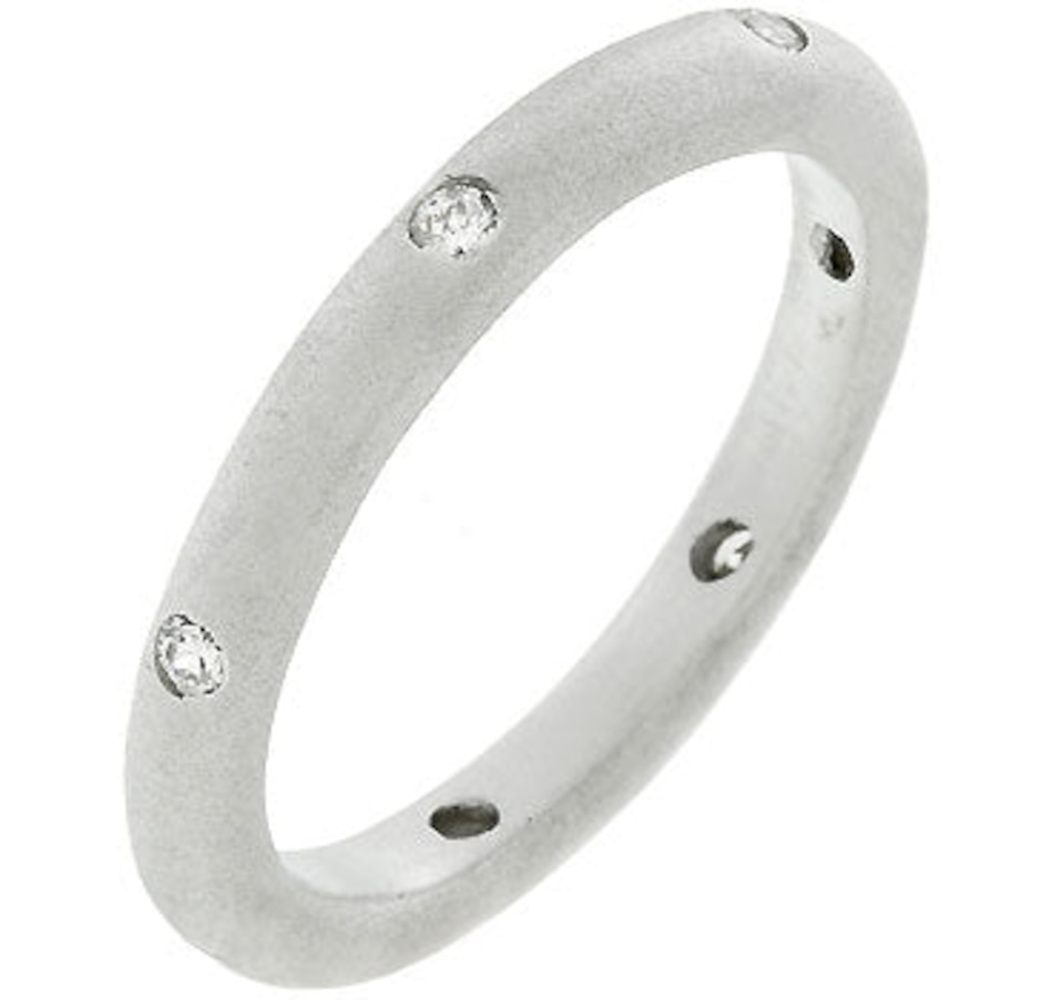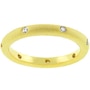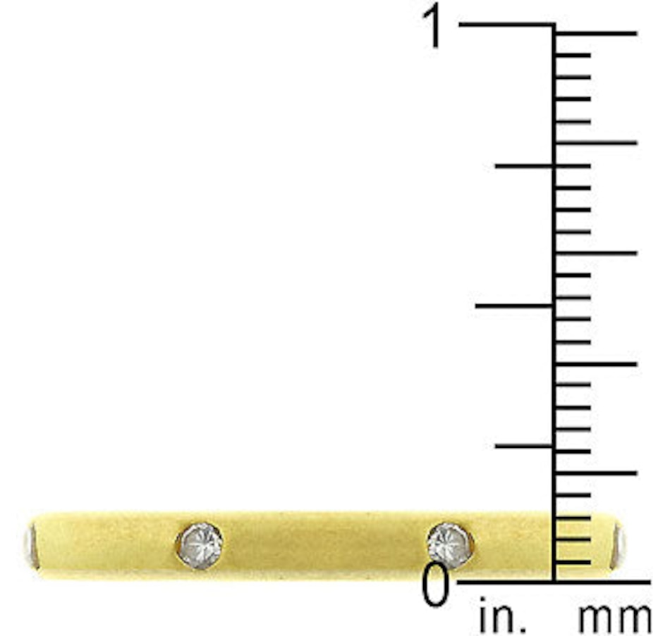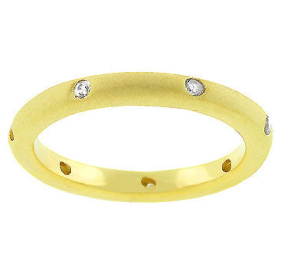 Feminine and subtle this eternity wedding band is a pleasuring mix of matte gold bonded and handset cubic zirconia. Fit for a woman. 18k plated gold is achieved using an electroplating process that coats the item with heavy layers of 18k Gold and color-treated to display a perfect 14k Hamilton gold color.