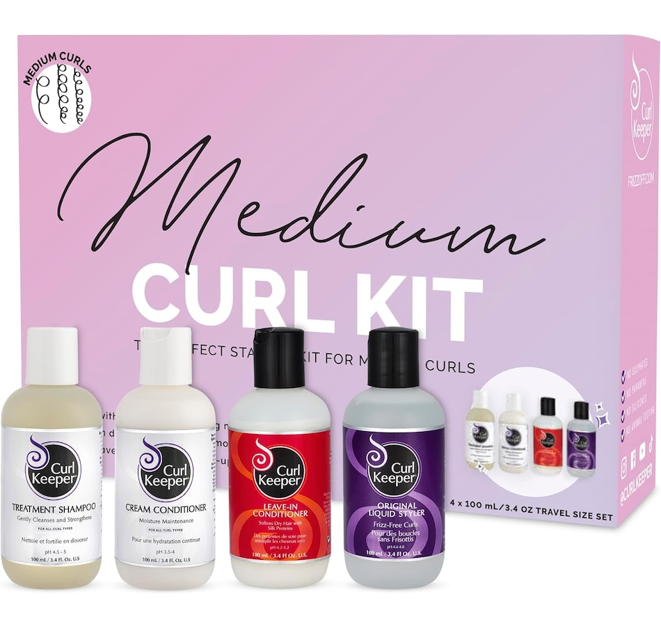The perfect starter or travel kit for Medium 3A-3C Curls. Includes: • 1 Treatment Shampoo 3.4 oz • 1 Cream Conditioner 3.4 oz • 1 Leave-In Conditioner 3.4 oz • 1 Curl Keeper Original 3.4 oz