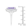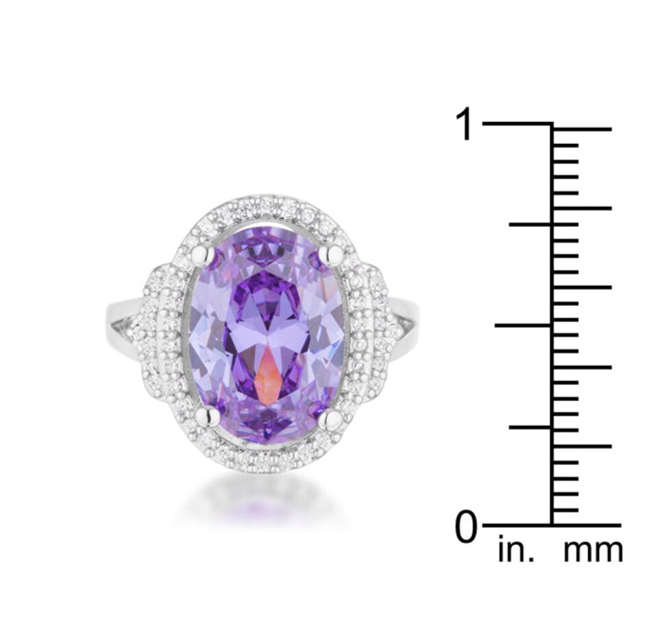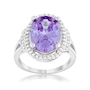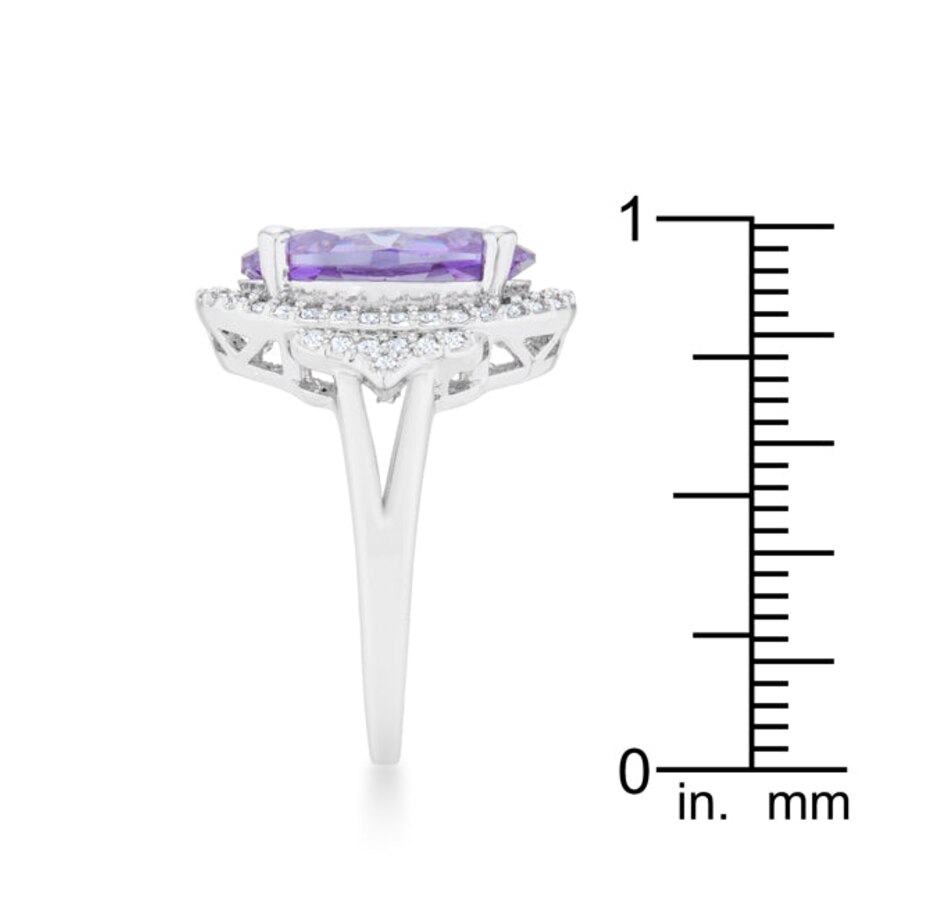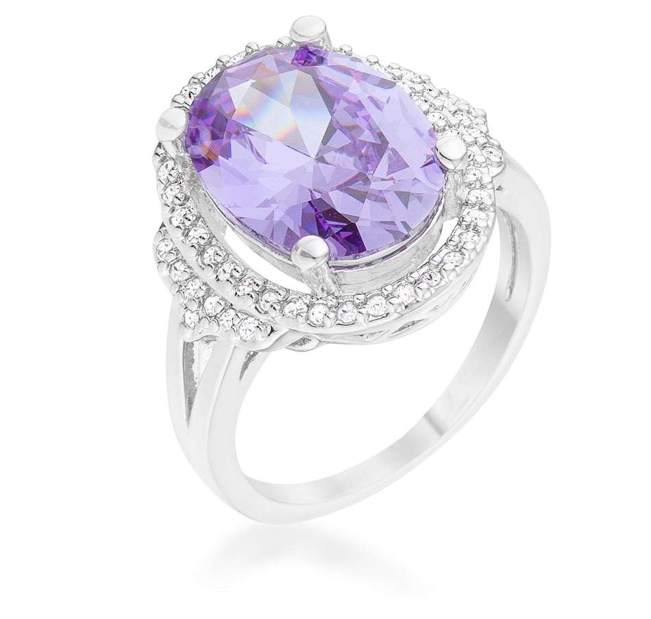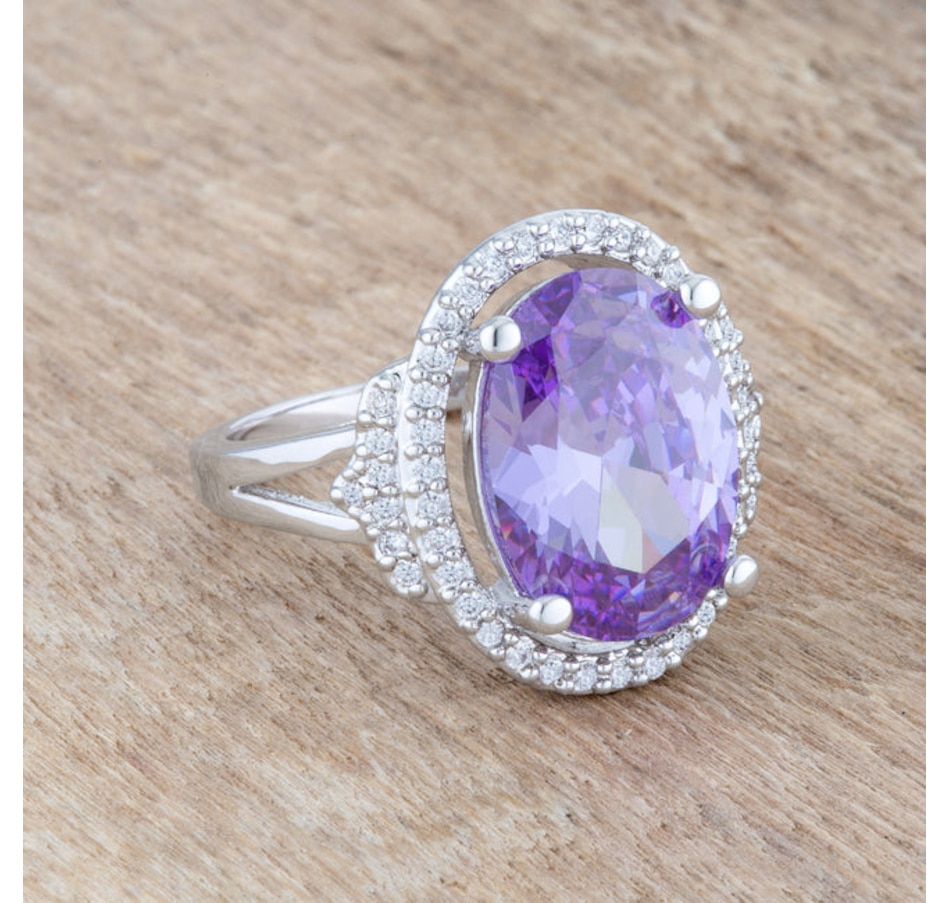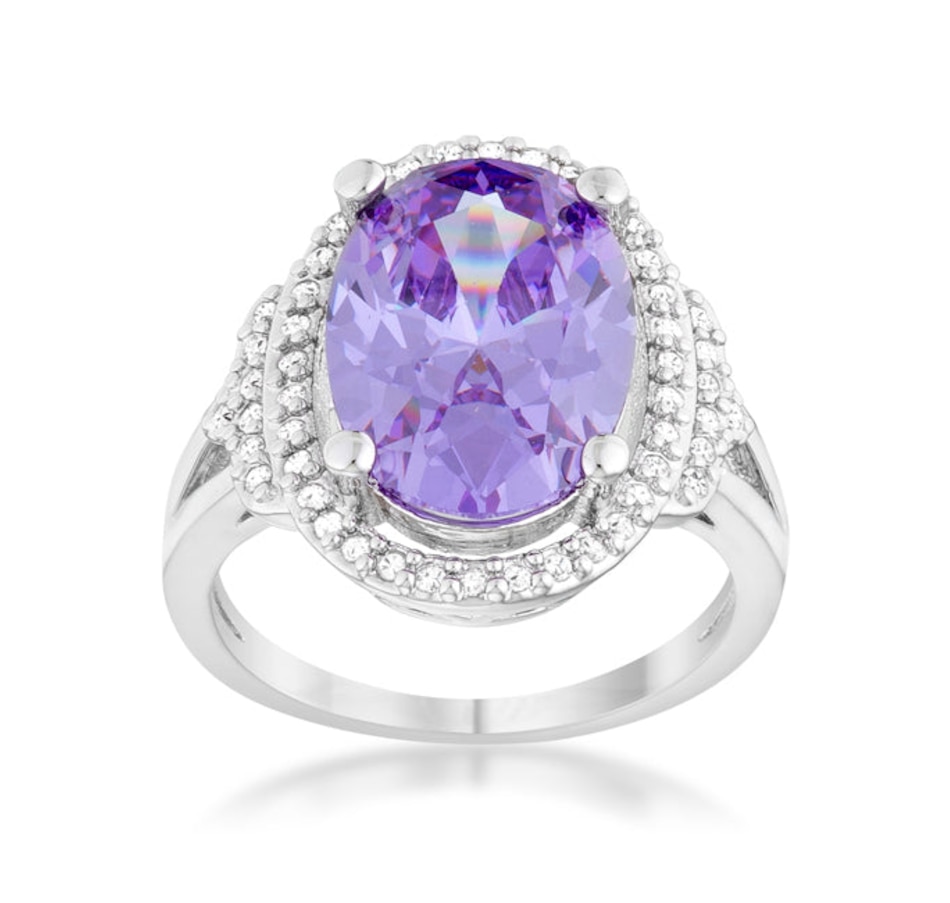 An elegant solitary amethyst stone surrounded by smaller stones takes center stage in this classic cocktail ring.