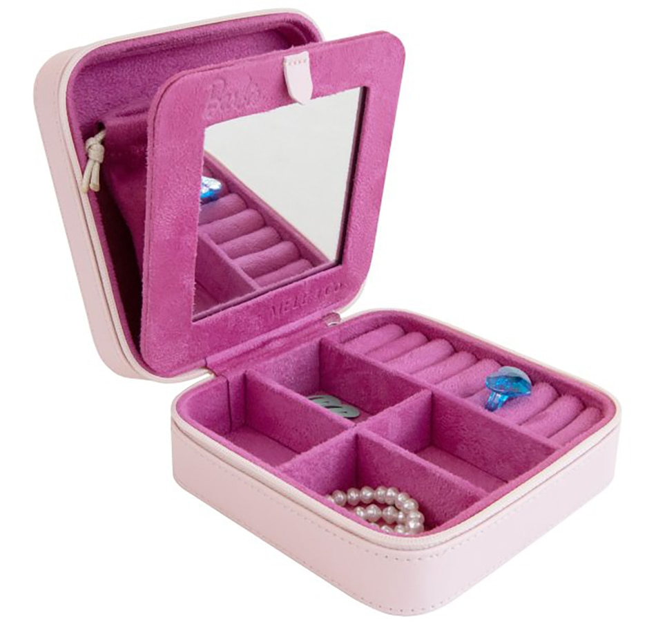 The Mele and Co Barbie Bitsy Bijou jewellery box and travel case keeps you focused on the essentials, with enough storage to keep your favourites close at hand. With its pink vegan leather exterior and hot pink suede interior, this case is just the ticket for any weekend getaway!