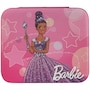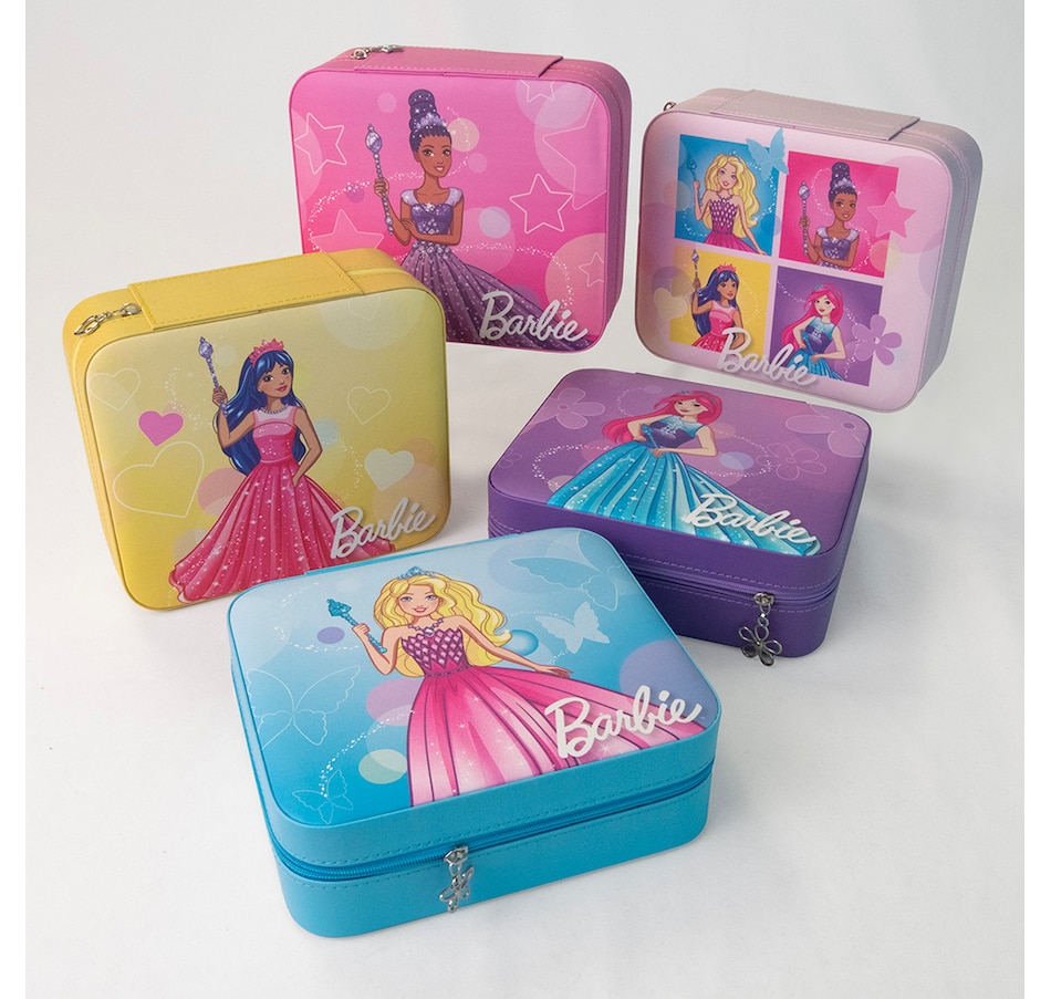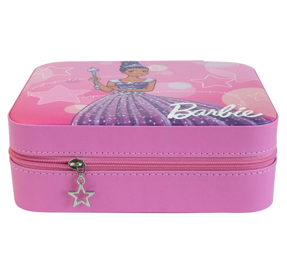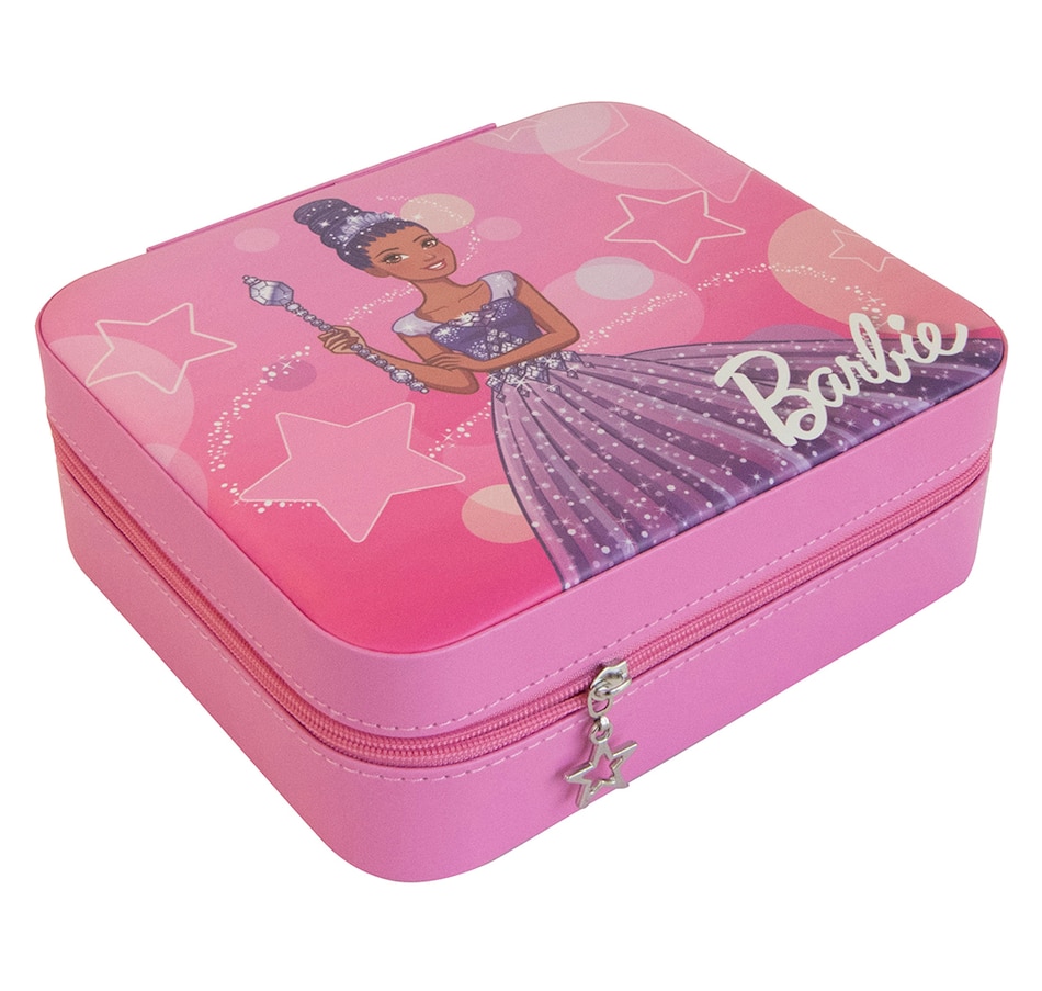 This fun jewellery case features a colourful Barbie star exterior design with a silver charm star pull. It has a fuchsia suede interior, which is perfect for holding all of their first trinkets and treasures. The interior lid features three jewellery straps, and the single compartment offers four open area sections with a central ring roll section.