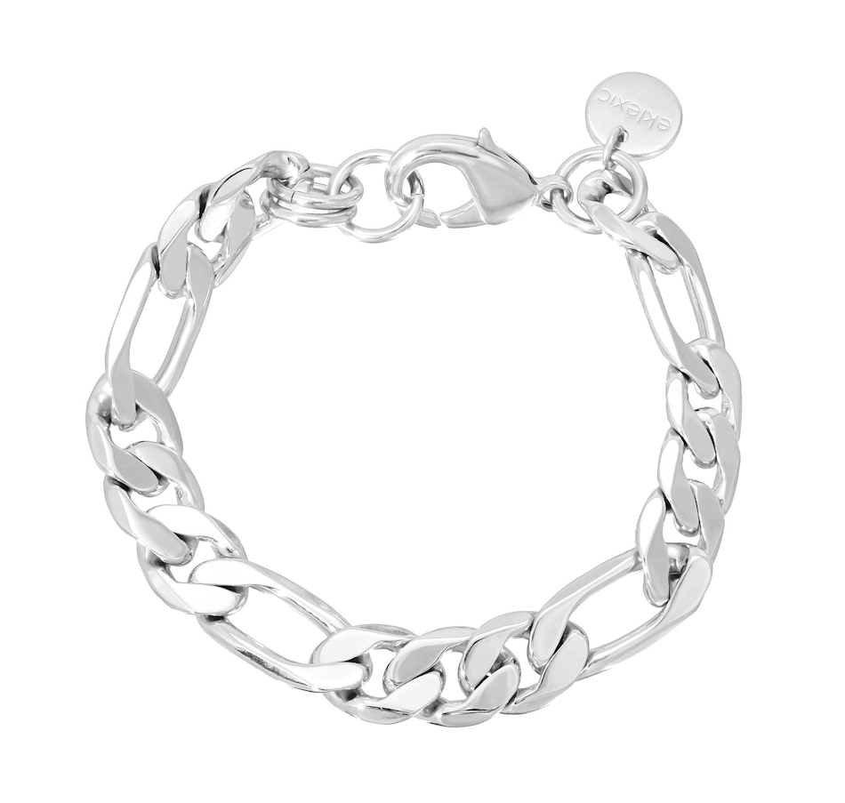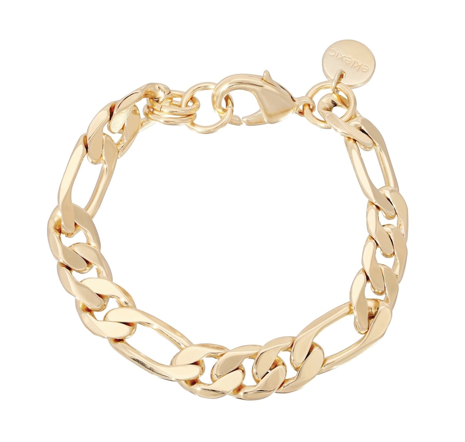 The Axel bracelet is made from a recycled brass figaro chain and fastened with a with lobster clasp. Finishes available: 14KÂ Gold plated or Rhodium-Silver plated.Chain measures:10.16mm (.40") wideClasp Measures:19mm (..75") longAvailable in the following Lengths:7", 7.5", 8", 8.5", 9", 9.5", 10"Â