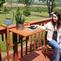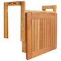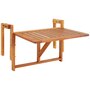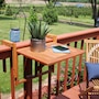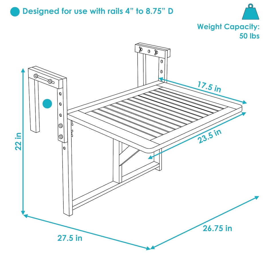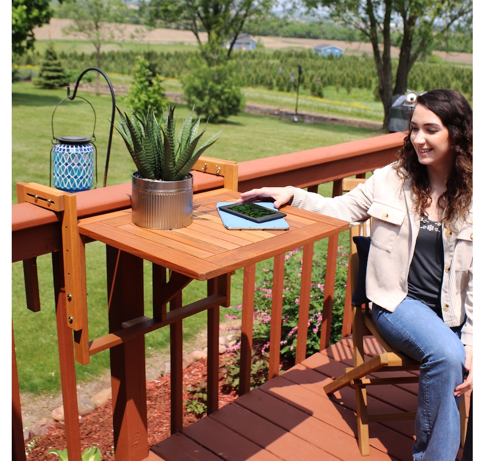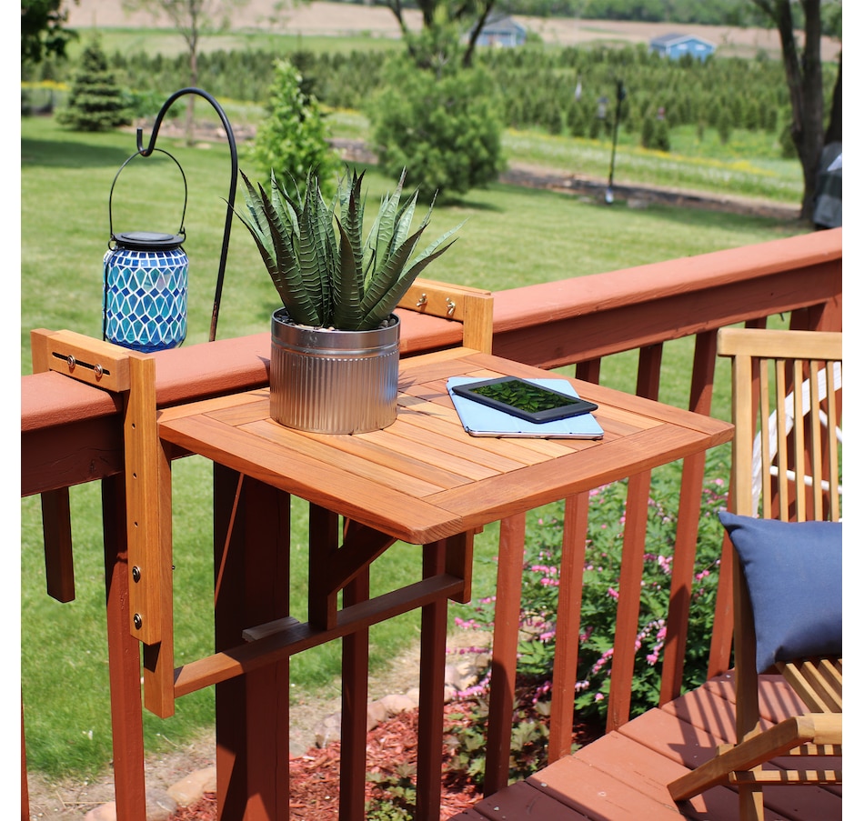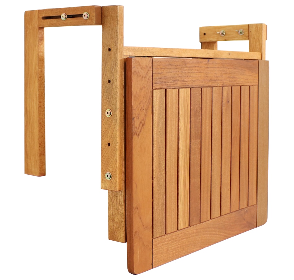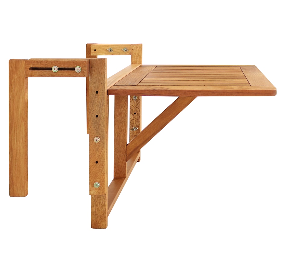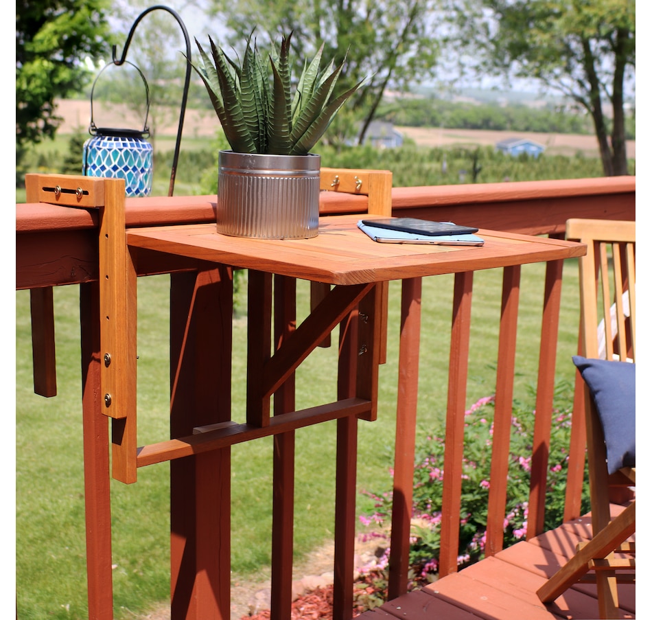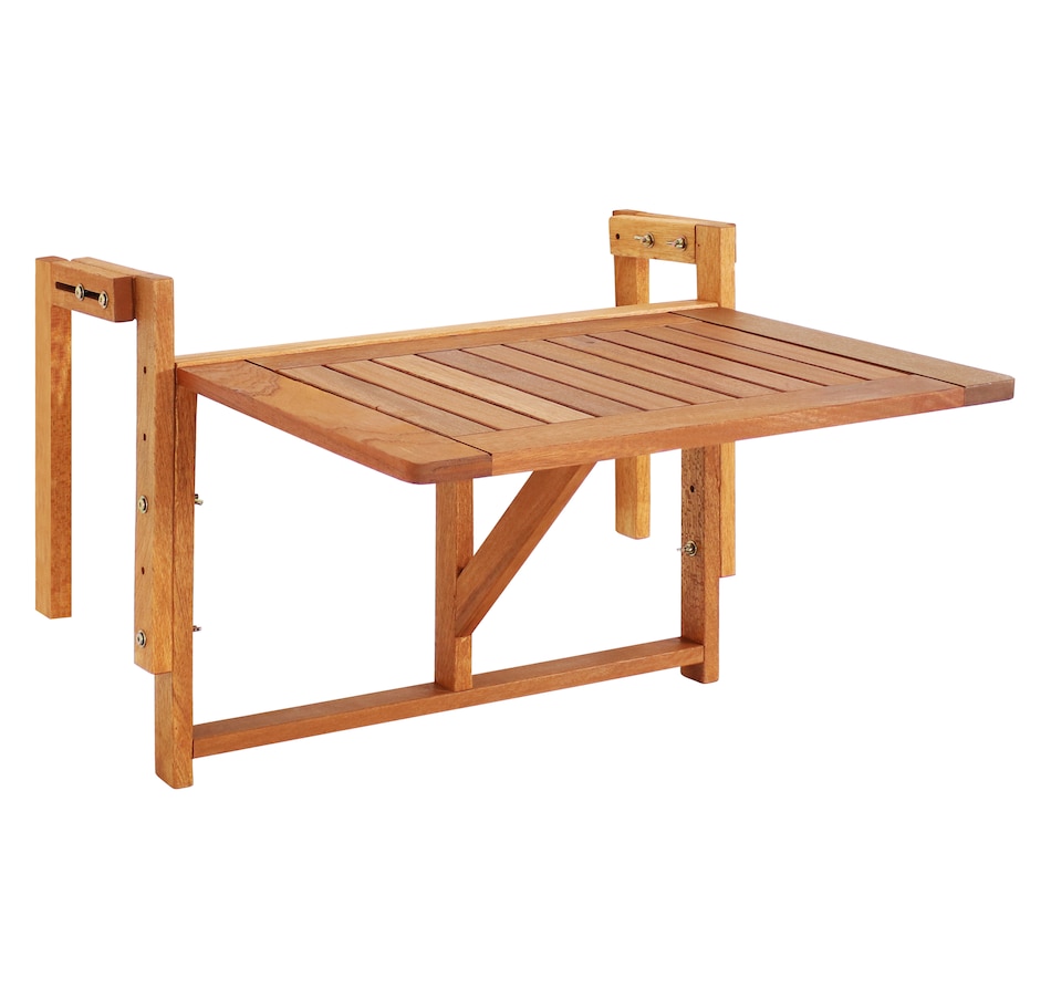 Save space and enjoy a cozy dining area with this convenient folding balcony table. A wonderful addition to small outdoor spaces like apartment balconies and patios, this unique table features sturdy brackets that allow the unit to be hung over a railing that is 6" deep or slimmer and can be easily adjusted so it is securely attached to the rail. Use the hanging brackets to adjust the tabletop to the right height before tightening the hardware and fastening the table to the railing. A hex key and all of the required hardware is included, so no additional tools are required. This sturdy table is made from durable meranti for an elegant style that will complement a variety of furniture pieces and the ability to withstand the elements. The space-saving tabletop easily folds down for plenty of space when it is not in use. This small tabletop provides an excellent surface for dining outdoors, reading a book, or providing a convenient surface for a radio, cool beverage, or card game.