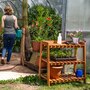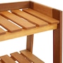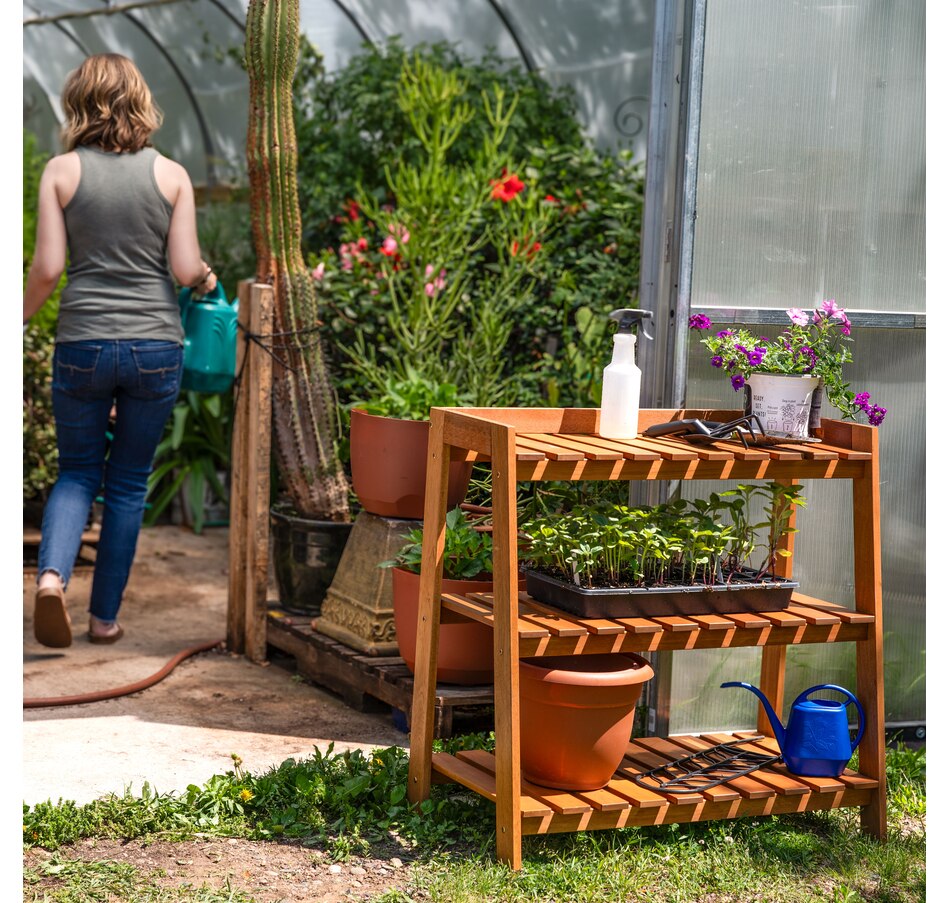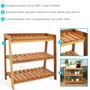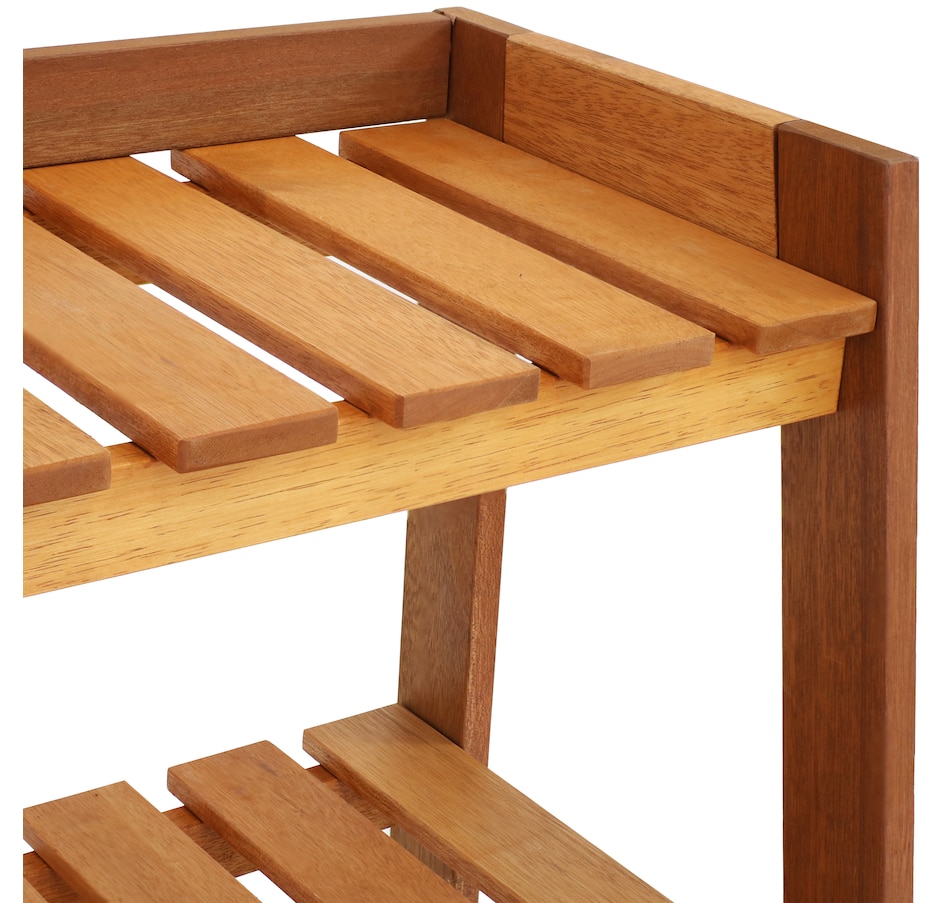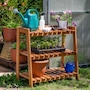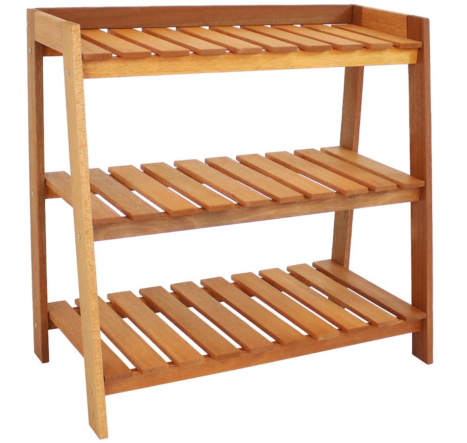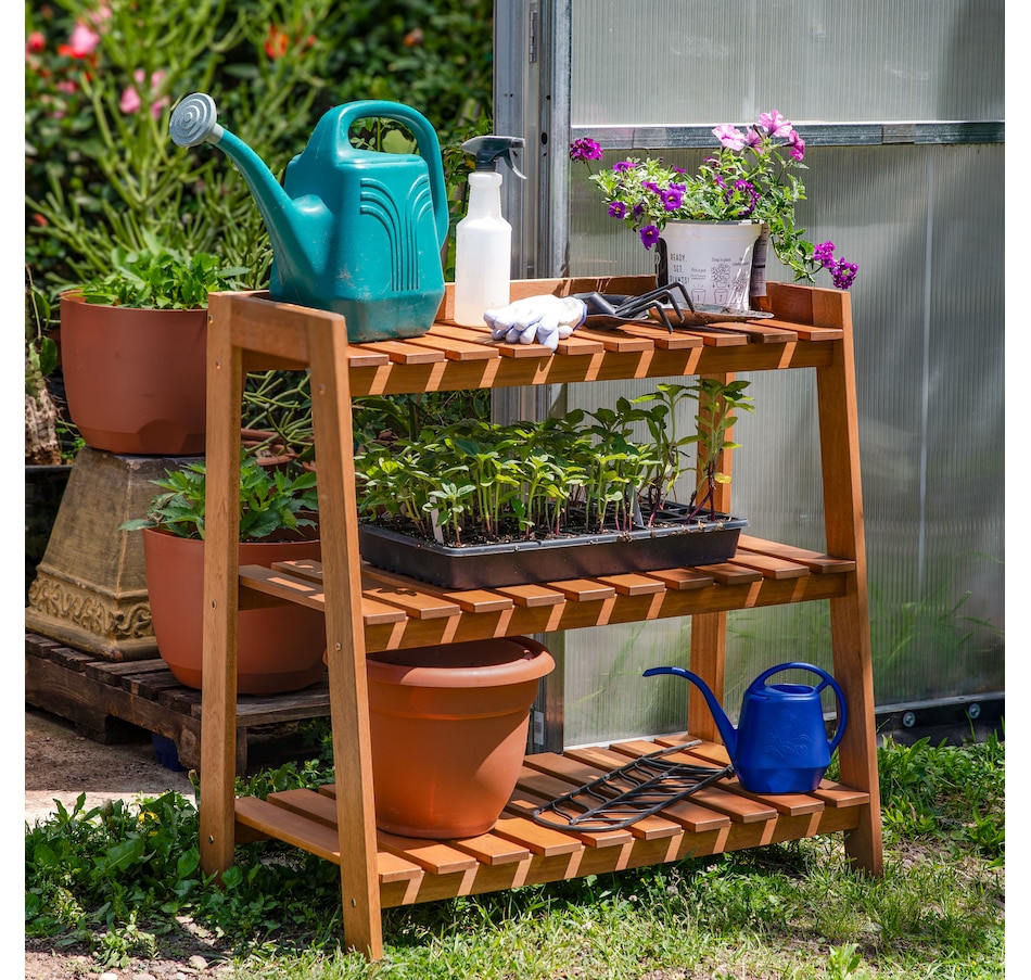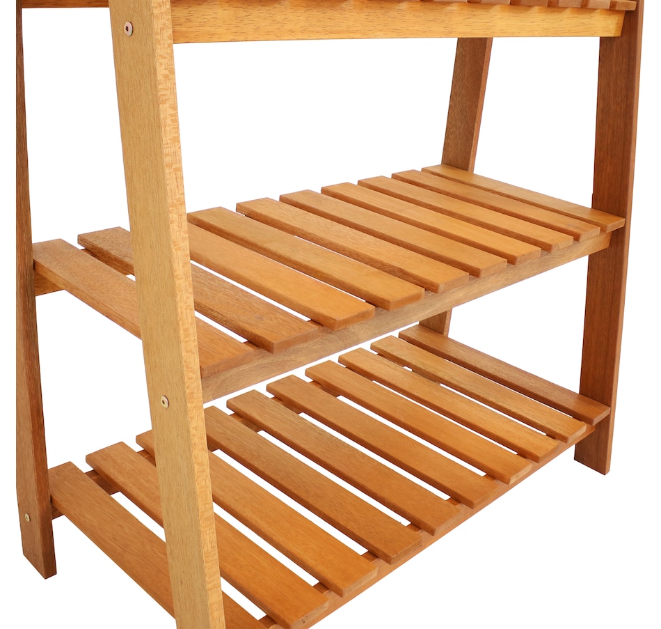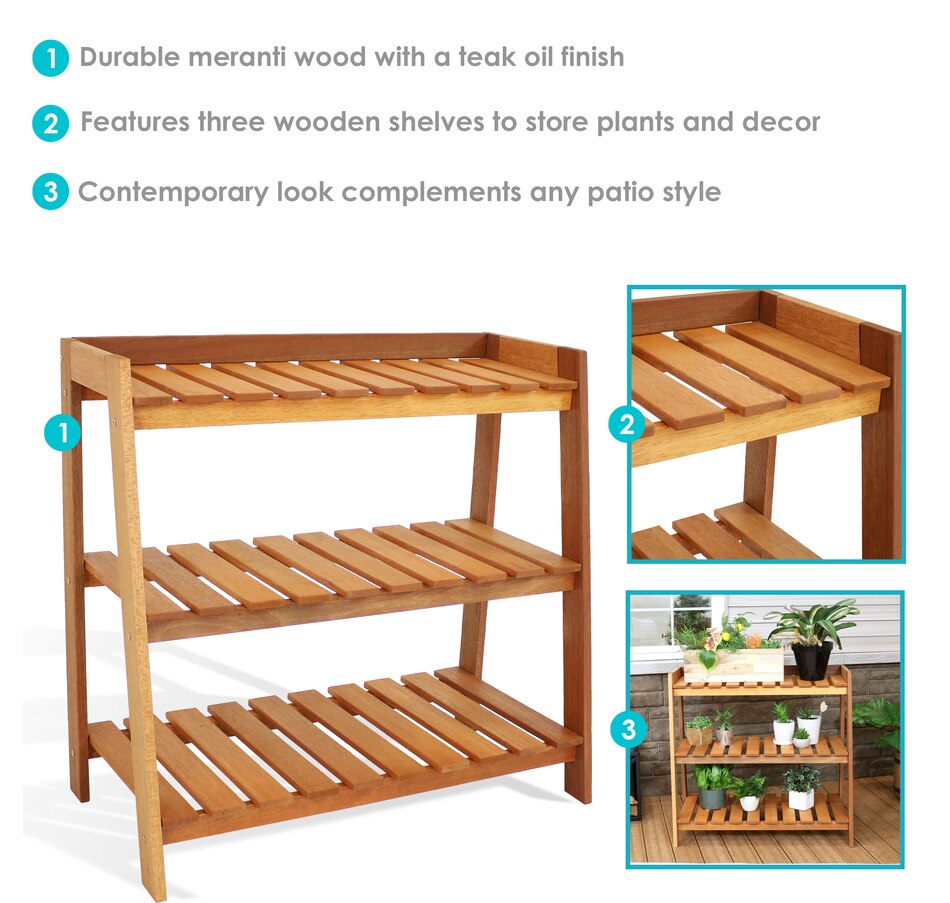 Keep gardening tools organized, store extra planters, garden gloves, and pots, or display favorite herbs, flowers, greens, and budding veggies with this sturdy garden shelf plant stand. This convenient outdoor shelf is made from durable yet lightweight Meranti wood with a stylish teak oil finish and has a contemporary design that is sure to complement any outdoor decor style while remaining durable against the elements. It has three sturdy, wooden storage shelves to store a number of home items such as pots, tools, decorations, and plants. Each shelf can support up to 100 lbs. This small shelf can be placed in a variety of different places. Place them outdoors on the patio, deck, yard, or garden to accent the home decor and keep budding greens close! This beautiful plant stand would look stunning on any deck with added blooms and elegance, sure to bring lively accents to any space.