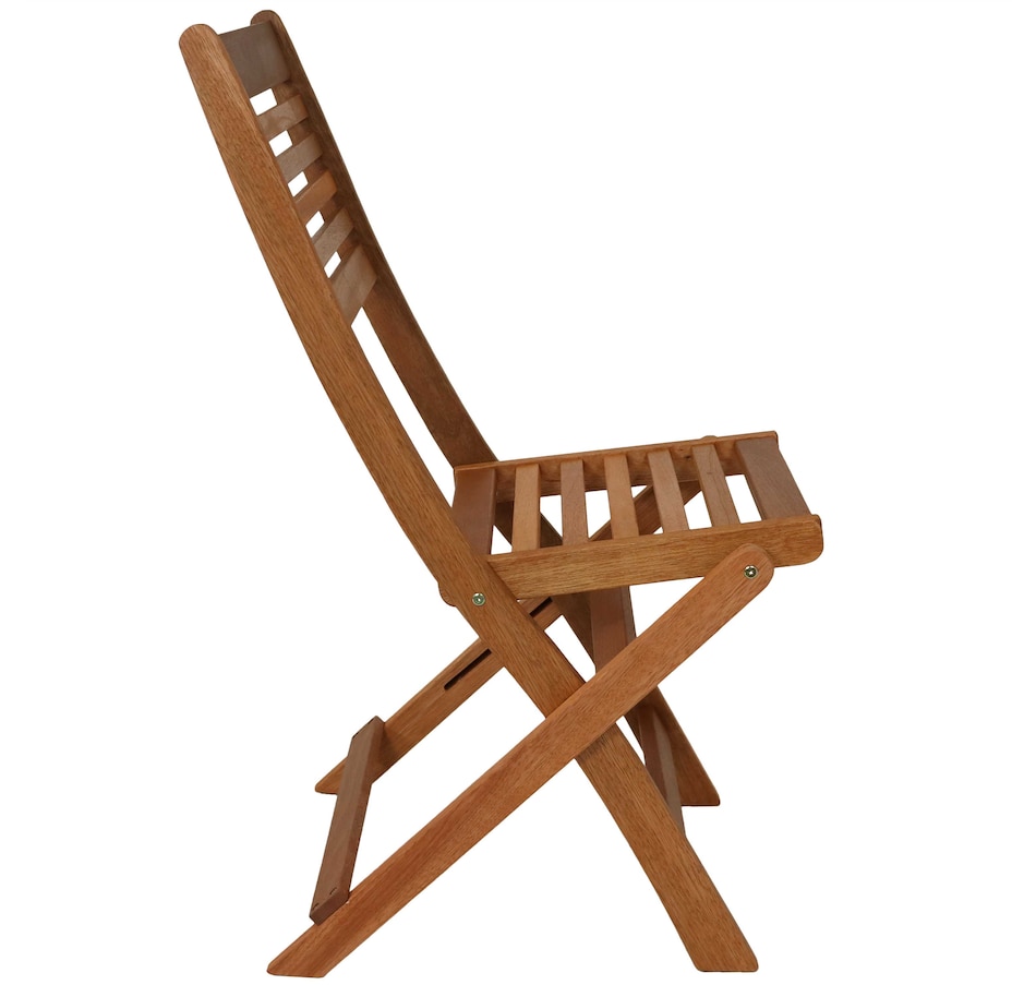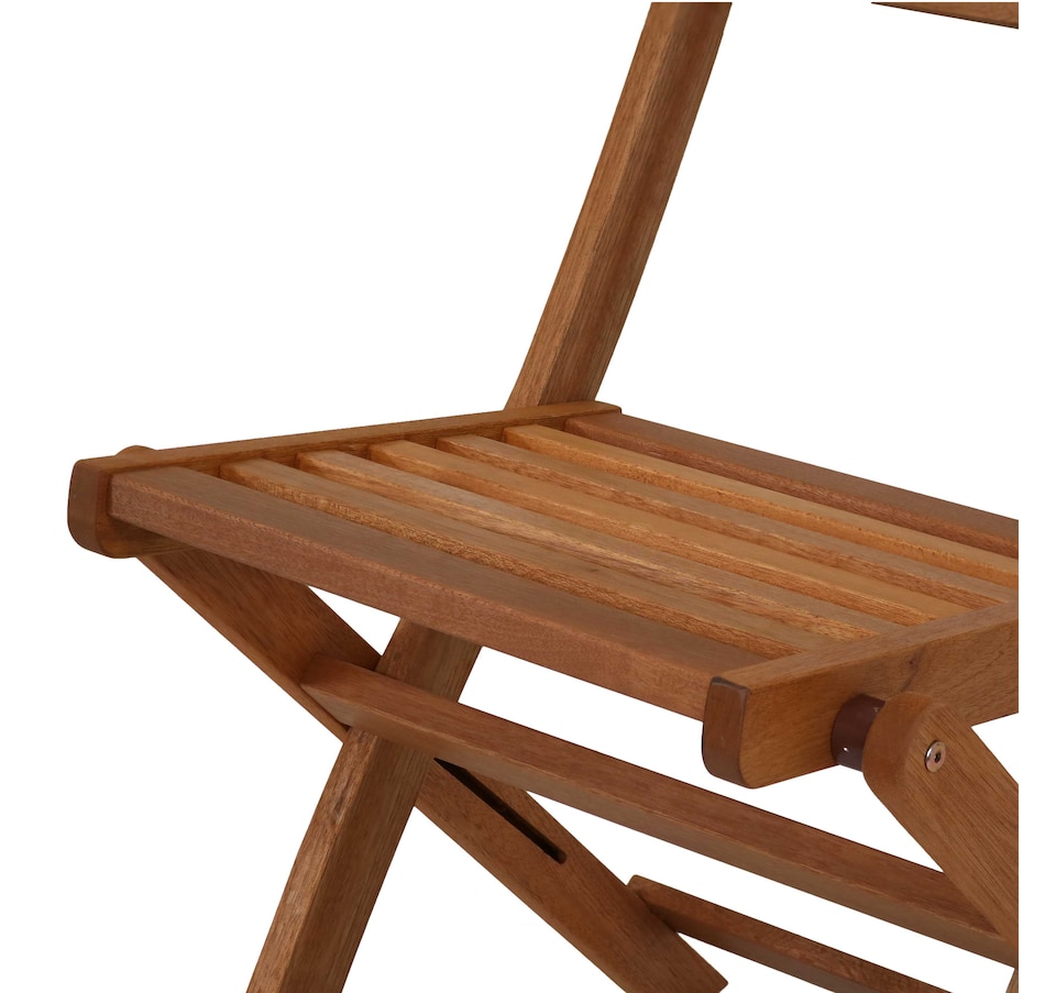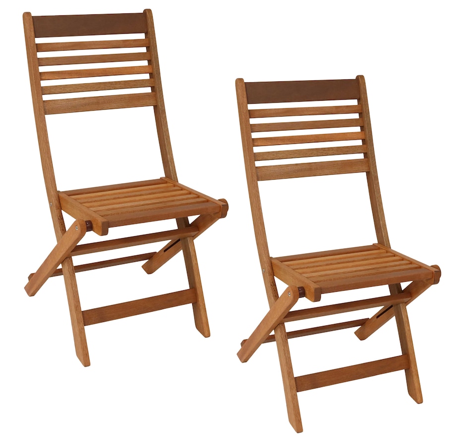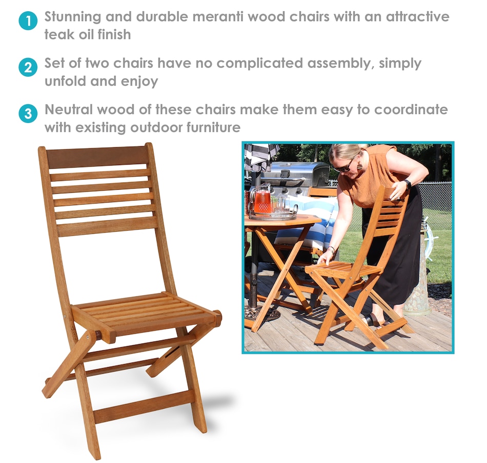 Add comfortable seating to any outdoor living space and enjoy warm days with friends and family with this Meranti wood outdoor, foldable patio chair set. This set features two chairs that have a classic, minimal styling that is sure to complement a variety of outdoor decor. Both of these chairs are constructed of Meranti wood that has a teak oil finish that enhances the warmth and natural beauty of the materials. These lightweight outdoor chairs do not require any assembly as they simply fold out right from the box so you can enjoy them right away. Plus, the folding feature makes them simple and easy to set up, take down, move to any desired location, and store when no longer in use. This versatile set complements many different accented tables and other furniture so you can create a gathering space that best fits your style. These chairs will look stunning on any patio, deck, porch, indoor patio, or out in the yard for beautiful talks with the people you love!