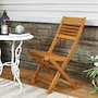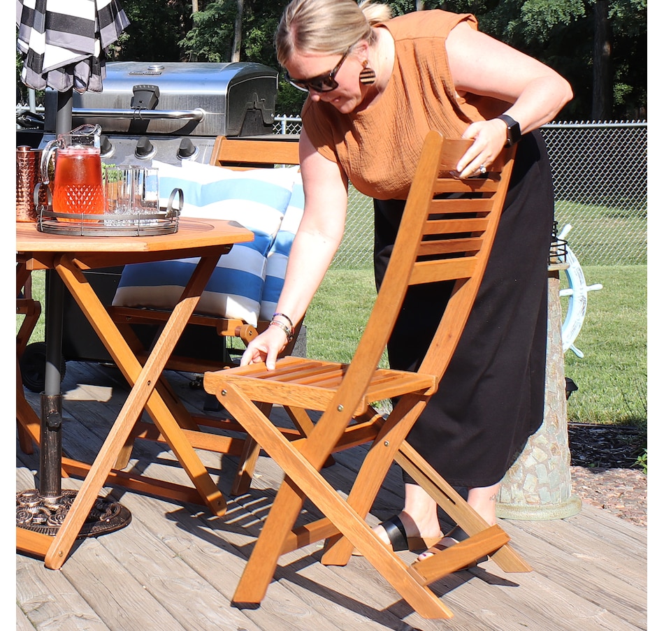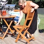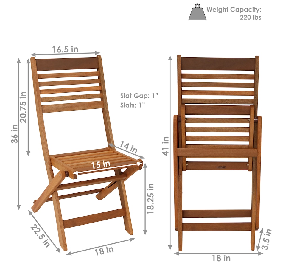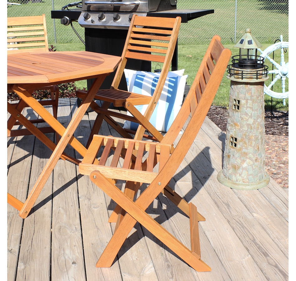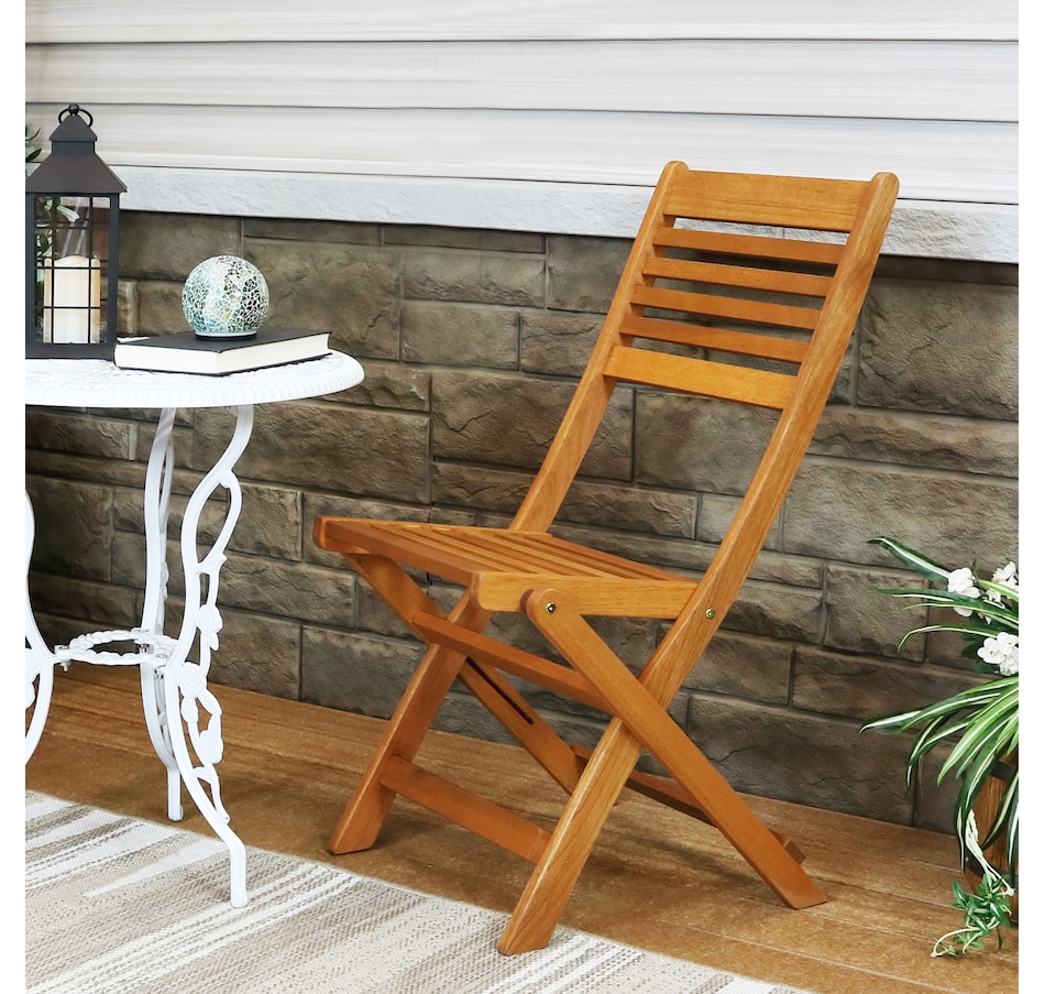 Add comfortable seating to any outdoor living space and enjoy warm days with friends and family with this Meranti wood outdoor, foldable patio chair set. This set features two chairs that have a classic, minimal styling that is sure to complement a variety of outdoor decor. Both of these chairs are constructed of Meranti wood that has a teak oil finish that enhances the warmth and natural beauty of the materials. These lightweight outdoor chairs do not require any assembly as they simply fold out right from the box so you can enjoy them right away. Plus, the folding feature makes them simple and easy to set up, take down, move to any desired location, and store when no longer in use. This versatile set complements many different accented tables and other furniture so you can create a gathering space that best fits your style. These chairs will look stunning on any patio, deck, porch, indoor patio, or out in the yard for beautiful talks with the people you love!