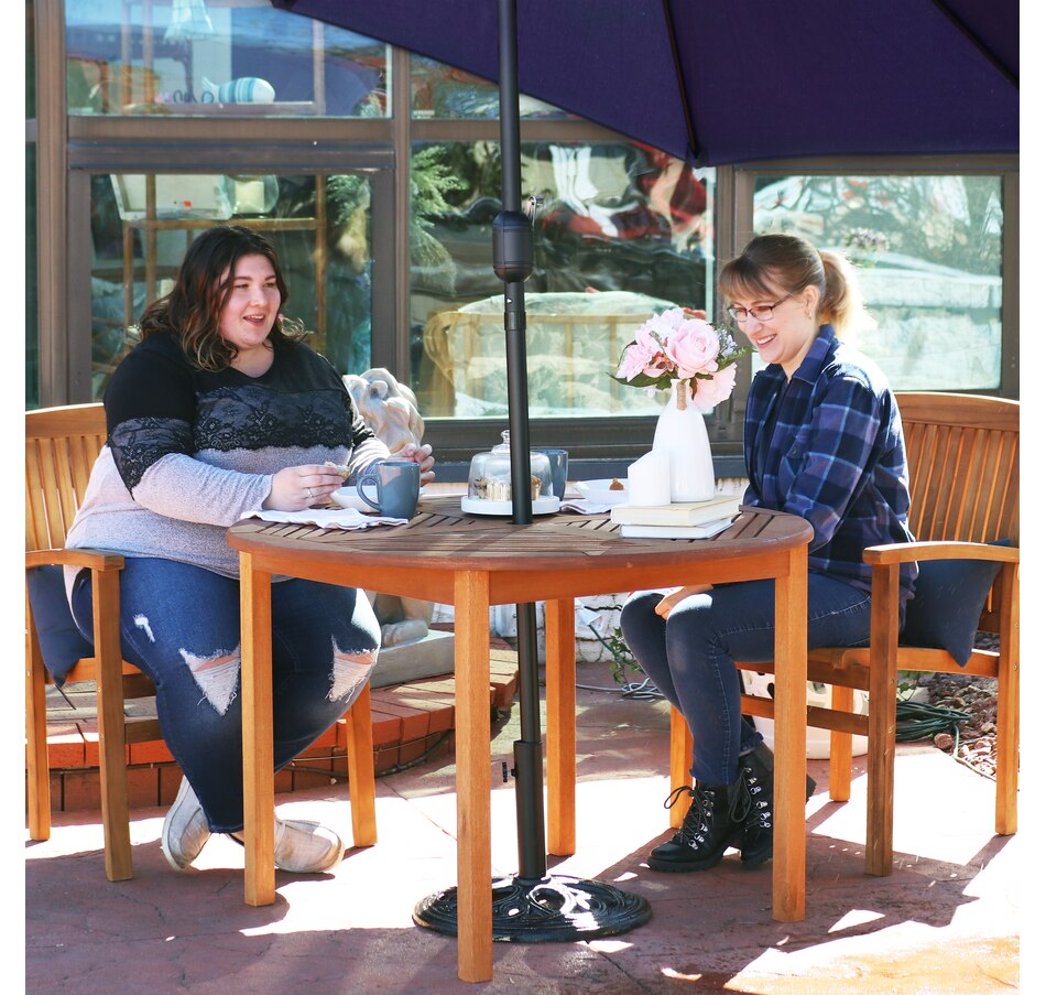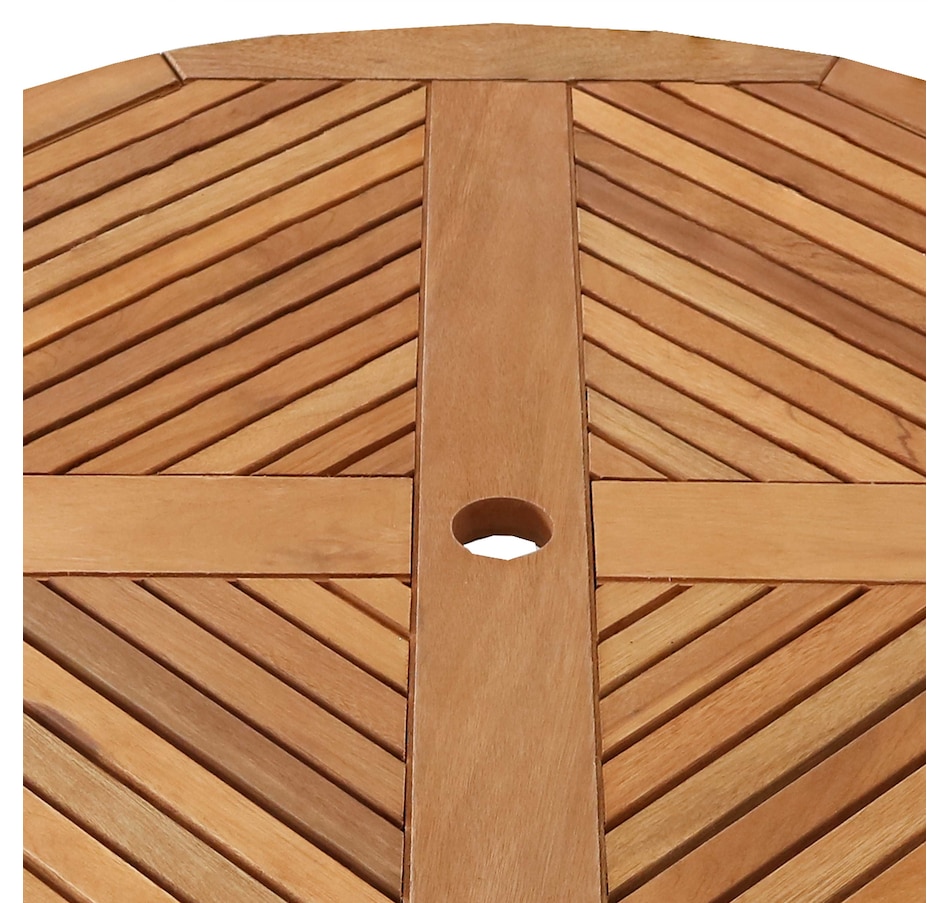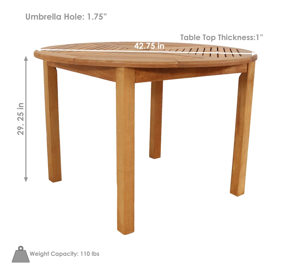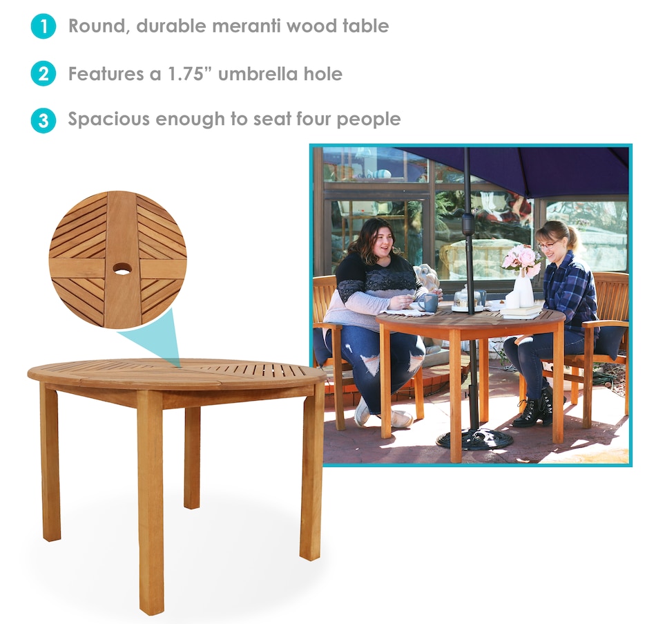 Create a peaceful outdoor dining area with the Meranti wood patio dining table. This piece of wooden furniture features an attractive teak oil finish that enhances the natural beauty of the material and increases the durability of the wood against the outdoor elements. This round outdoor table makes a stylish addition to any outdoor living space, including balconies, decks, patios, porches, and other areas outside in need of a beautiful gathering space. It could also be used in indoor spaces like a covered porch or sunroom. Plus, all the necessary components, hardware, and tools are in the box, so it can be assembled right away. Enjoy delicious meals and beautiful nights with friends with this wooden patio table in outdoor living spaces in no time at all.