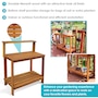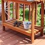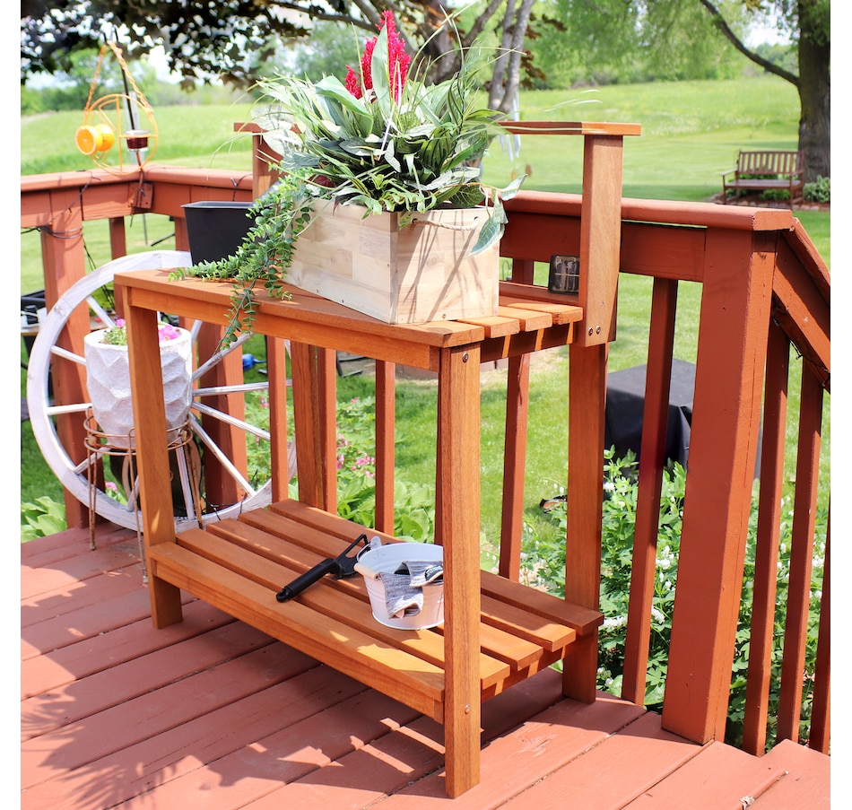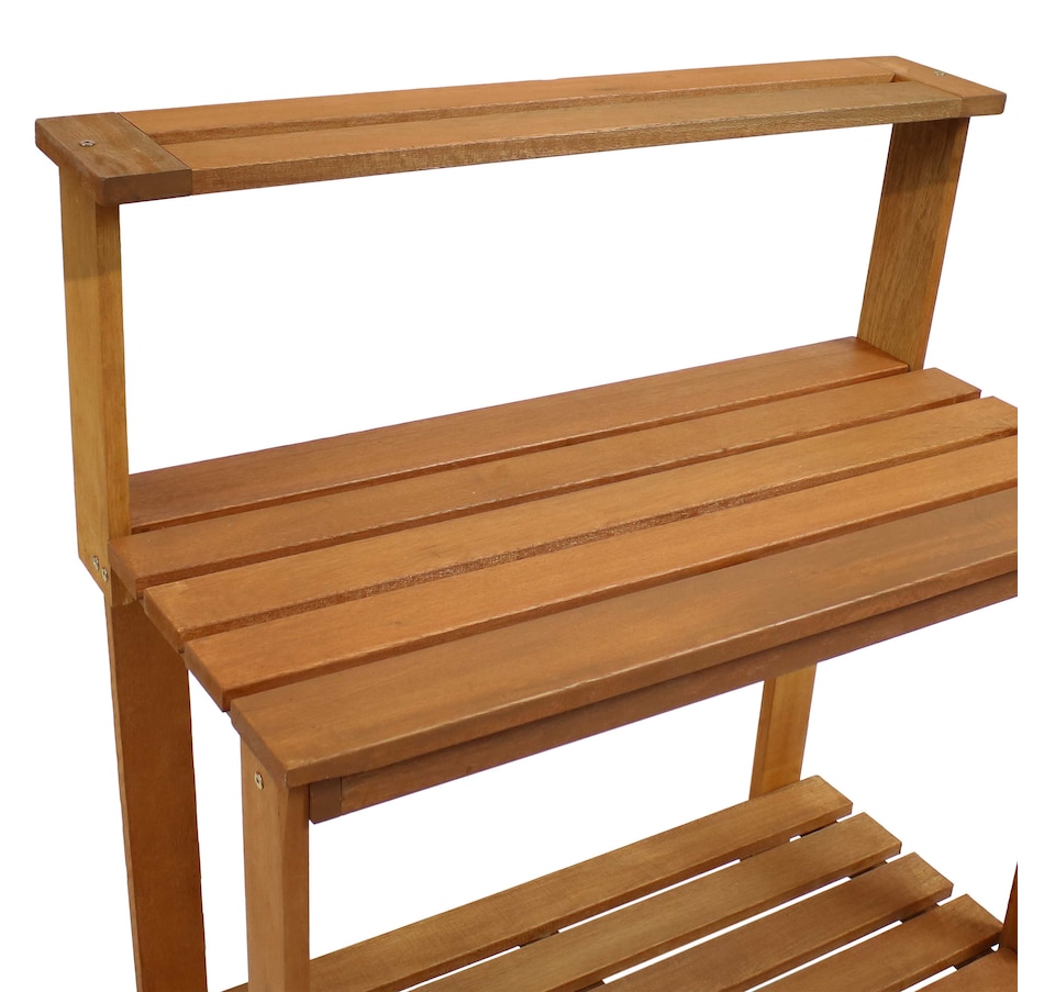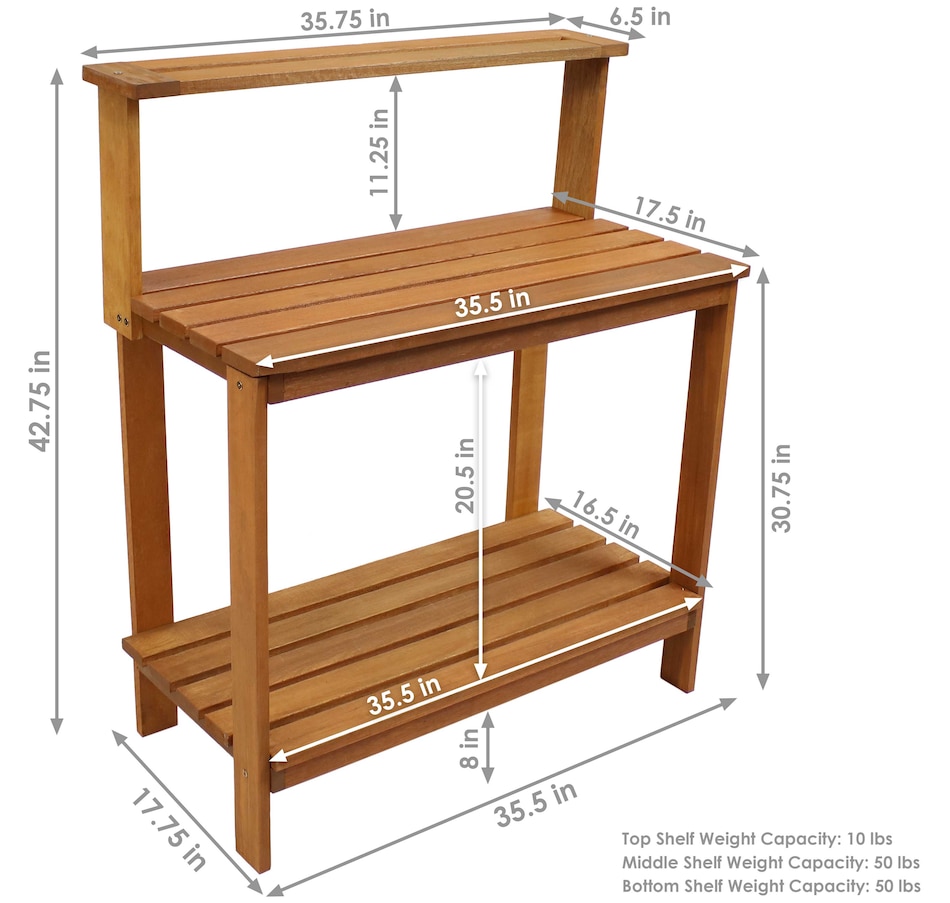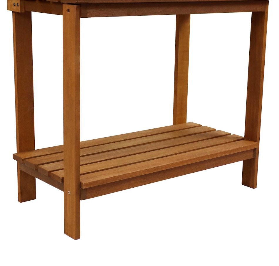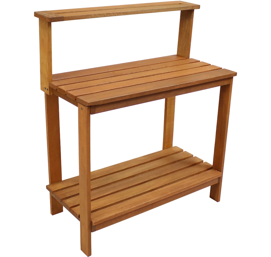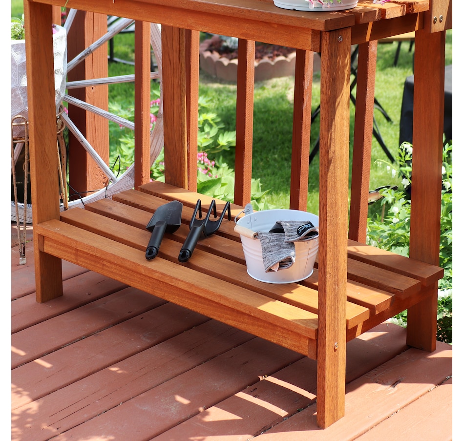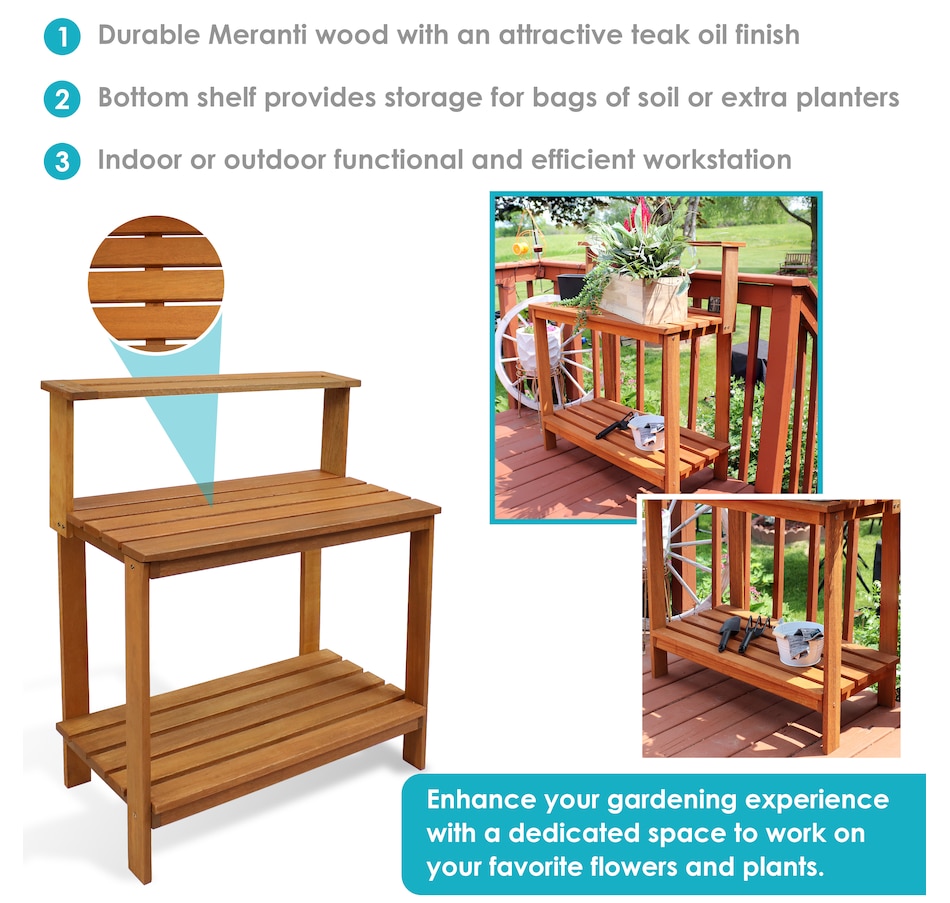 This wood potting bench offers practical storage and a sturdy workspace for gardening tasks. The spacious tabletop and lower shelf provide ample room for potting plants, organizing tools, and storing soil or pots, while a small upper shelf keeps smaller items like seed packets and hand tools within reach. Constructed from meranti wood and finished with teak oil, it stands up well to outdoor conditions while adding a warm, natural look to patios, greenhouses, or garden spaces. The solid build offers a reliable surface for repotting plants and keeping gardening supplies in order. Versatile enough for both indoor and outdoor use, this potting table works well in backyards, garages, sunrooms, or on covered patios, delivering a durable and attractive station for all kinds of plant care and prep. Assembly is straightforward with all tools and hardware included in the box.