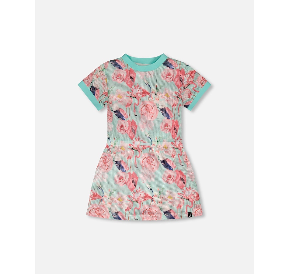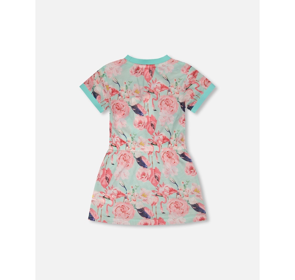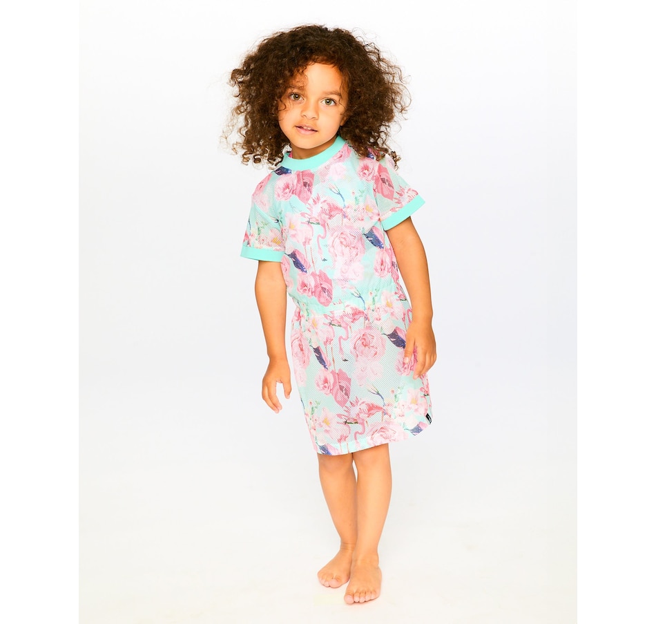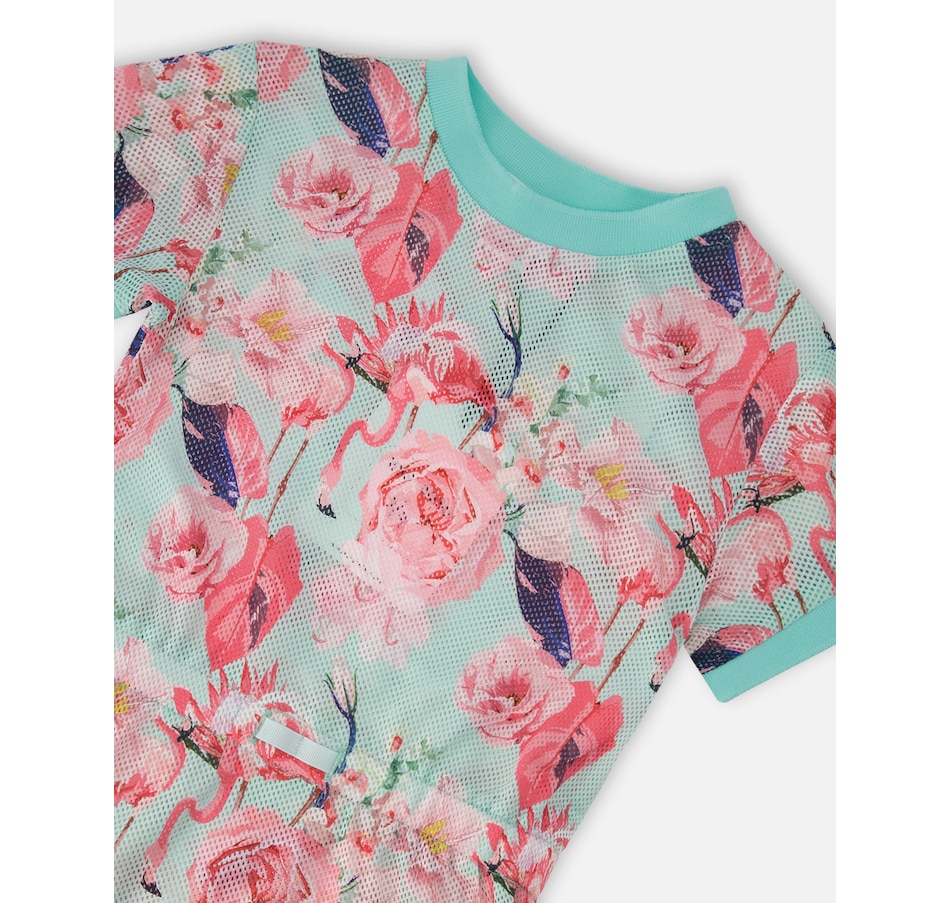 The mesh beach dress in blue with flamingo print is a playful cover-up for sunny days by the sea. Designed with short sleeves, an allover flamingo and flower print, and a comfortable crew neckline, this beach layer features an elastic waist with a drawstring for an adjustable fit. Lightweight and breathable, this piece adds a pop of color on top of any swimsuit.
