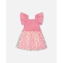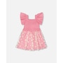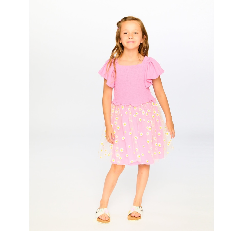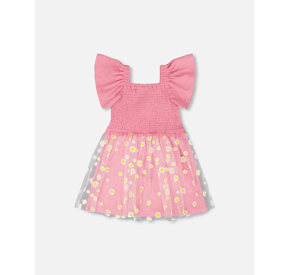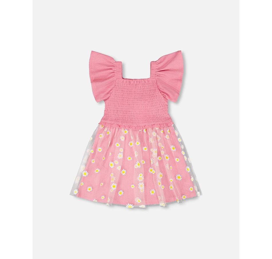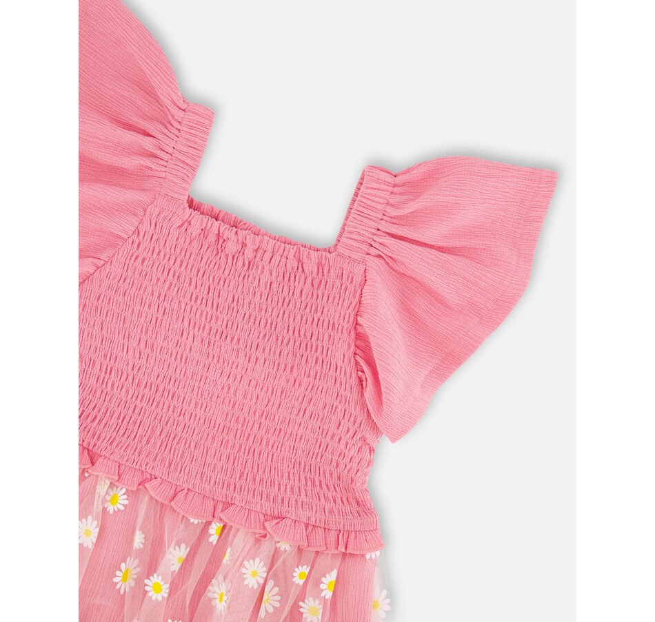 Delicate and breezy, our mesh and crinkle jersey dress with smocking in pink is made for sunny days. This sleeveless dress features stretchy smocking at the bodice, playful flutter straps, and a flared skirt with an allover daisy print. A joyful design that pairs perfectly with other cheerful looks from the “Explosion Of Daisies” collection.