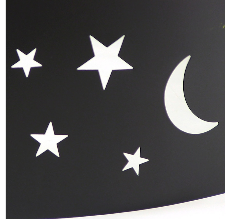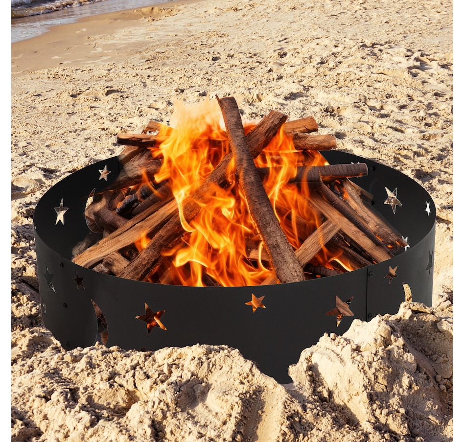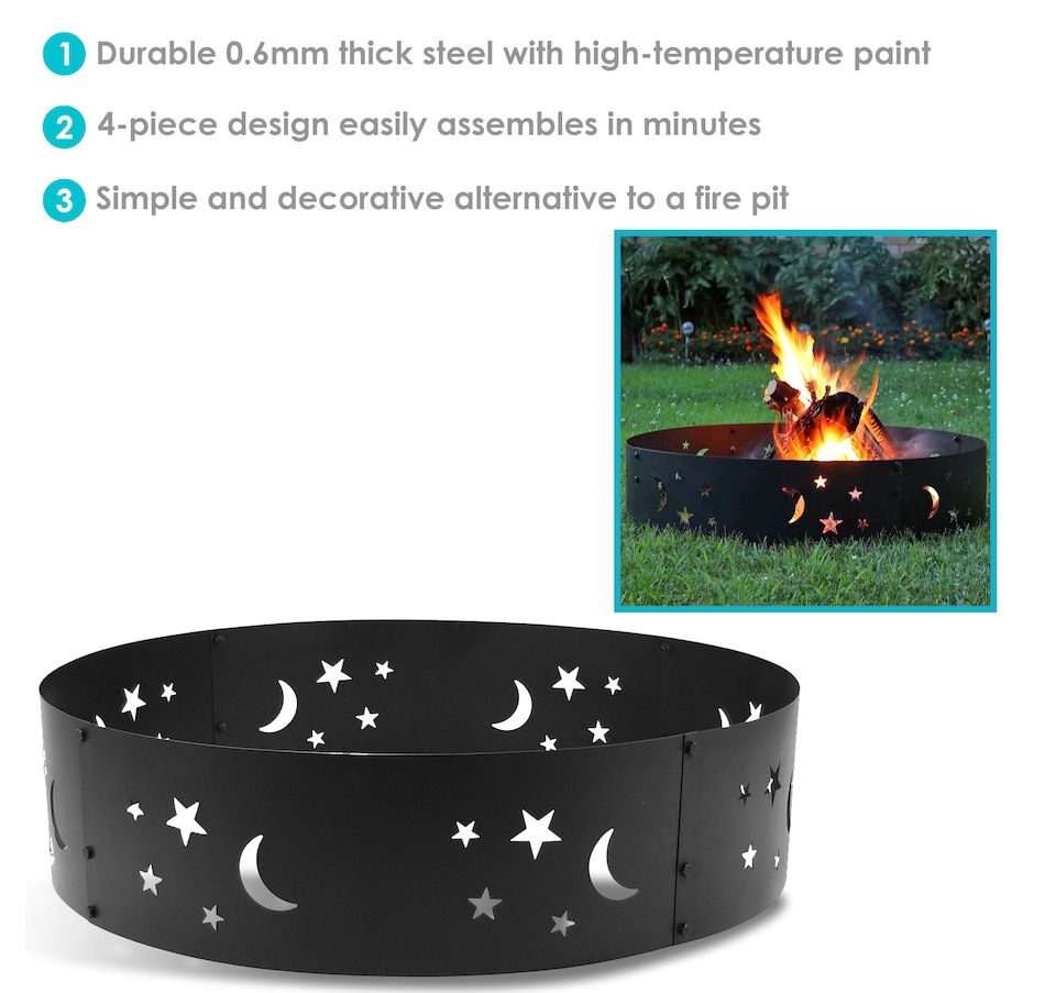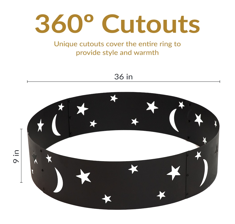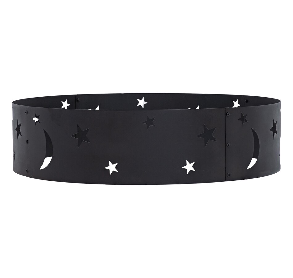 Capture the beauty of the night sky with this heavy-duty fire pit ring. Featuring a 360-degree design and a black finish, this firepit ring has an intricately carved moon and stars design. Its open design makes it wonderful for roasting marshmallows and hot dogs over an open fire. This durable bonfire fire pit is made of dependable steel for a long-lasting product life. Plus, it is easy to assemble. Simply connect the four pieces together, and the backyard fire pit is ready to use. Its lightweight design makes it easy to move from place to place in the backyard. It’s also easy to pack up and take along during the next camping trip or day trip.