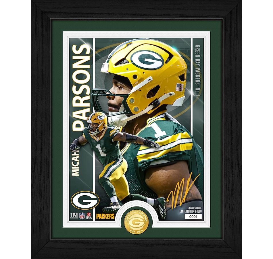 The Green Bay Packers' Micah Parsons is featured in this limited edition 13" x 16" framed collectible. It includes a stunning 8" x 11" custom-designed artist print and a minted 39mm Green Bay Packers bronze coin. Elegantly double-matted and protected under acrylic glass, this premium display piece is a must-have for NFL fans and collectors. Only 1,000 individually numbered pieces exist, and each officially licensed by the NFL and NFLPA. Each frame includes a certificate of authenticity. Proudly made in the U.S.A. by The Highland Mint, this collectible arrives ready to hang and ready to impress.