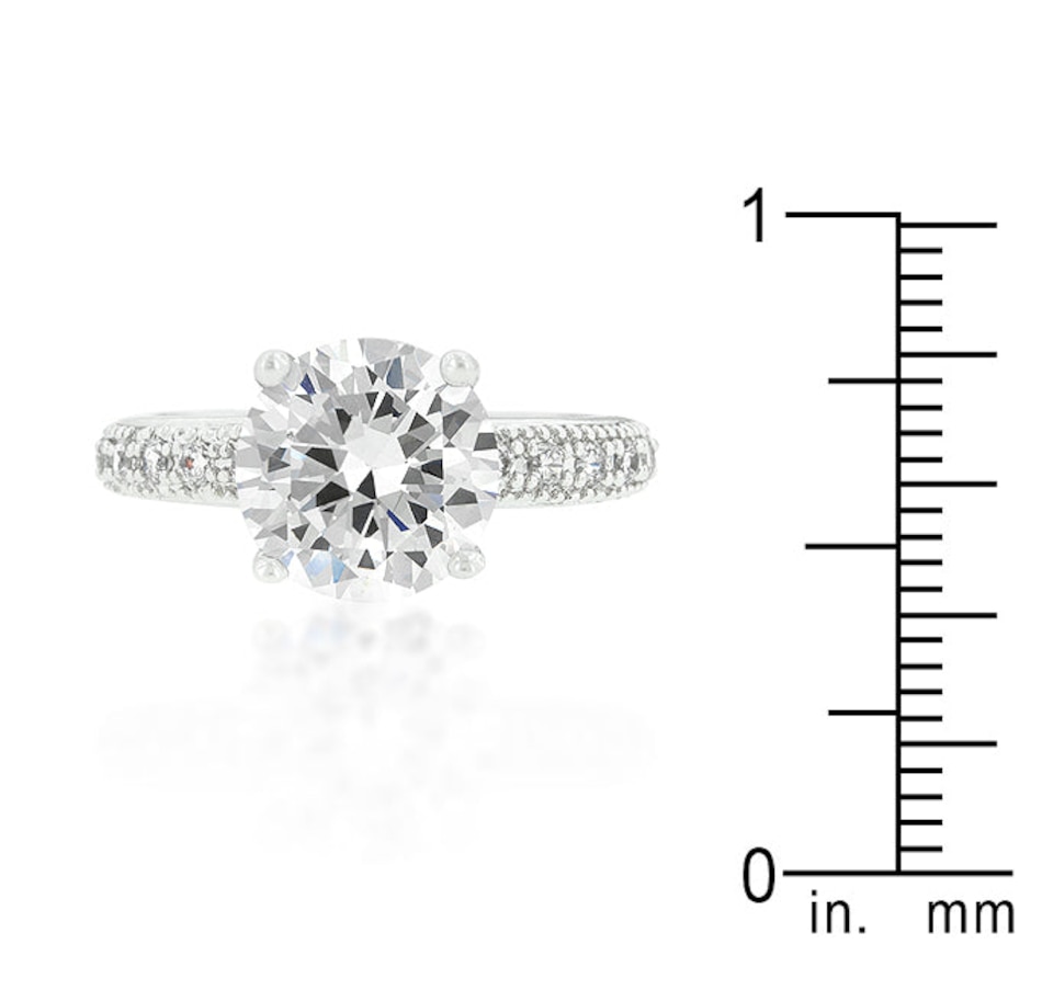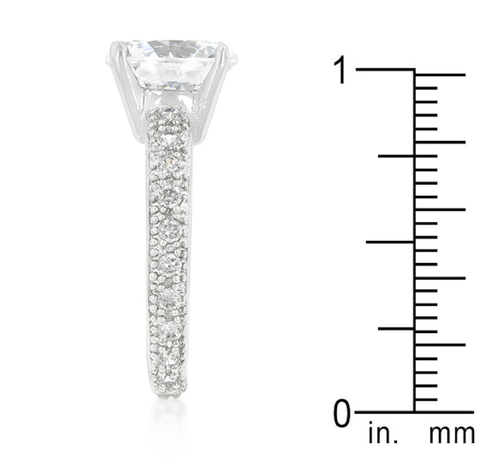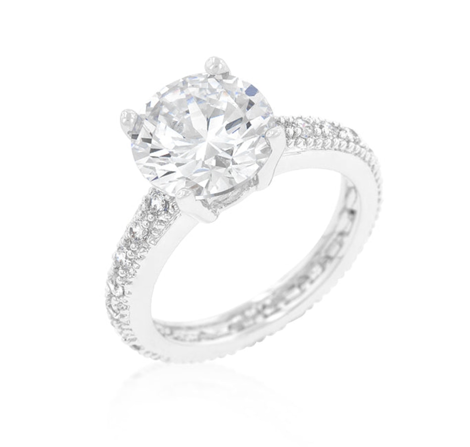 Feminine and illustrious. Simple and sophisticated. Fashioned in an elegant cubic zirconia this micro pave style is handset and nicely accents its large center stone. Our genuine finish is achieved using an electroplating process that coats the item with heavy layers of a close cousin to platinum which gives our jewelry a platinum luster.