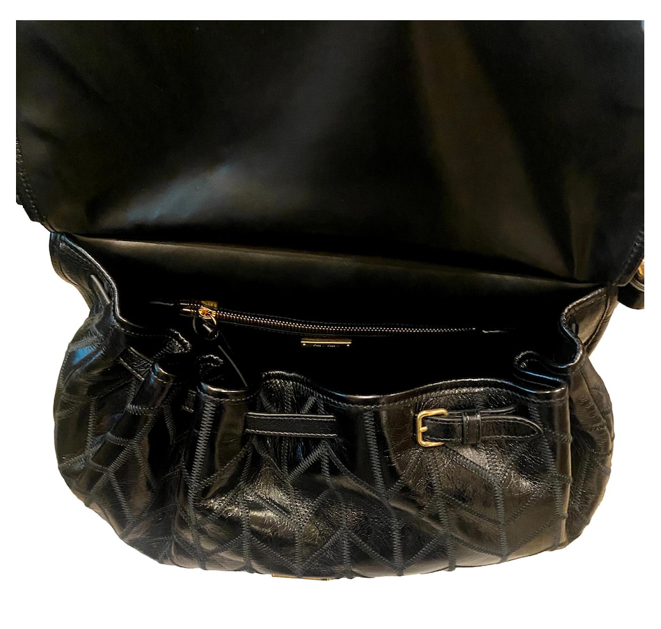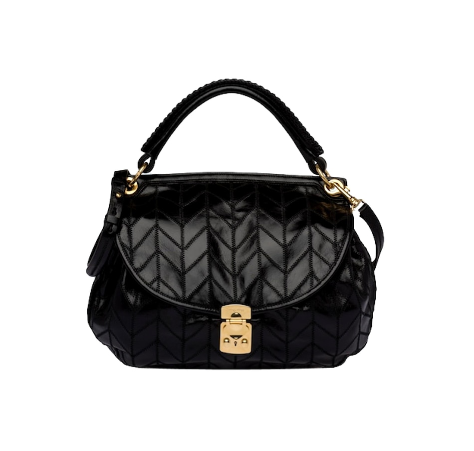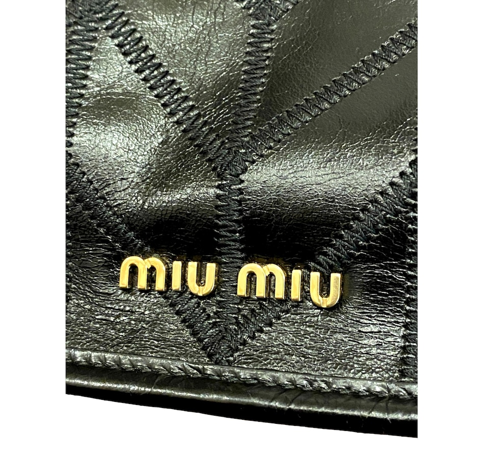 This luxurious Miu Miu shoulder bag is crafted of vitello shine patch leather in black. The handstitched geometric patchwork paired with the gold-tone hardware makes for a chic ensemble. Store daily essentials in the spacious black fabric interior including one zip pocket. The overall look is finished with a top handle and removable/adjustable crossbody strap for versatile use.  This Miu Miu Vitello Shine handbag from the iconic fashion house will be a closet staple for years to come! Model: 5BC075 Black Vitello Shine Patch Leather Stitched Patchwork Motif Gold-Tone Hardware Push Lock Clasp Interior: One zipper pocket Interior Lining: Black Fabric Interior Drawstring Buckle Detail Rolled Leather Handle, Drop: 5" Removable/Adjustable crossbody strap drop: 18-21" Dimensions: 14" x 4.5" x 8.5" (LxDxH) Includes authenticity cards and Miu Miu dust bag Made in Italy