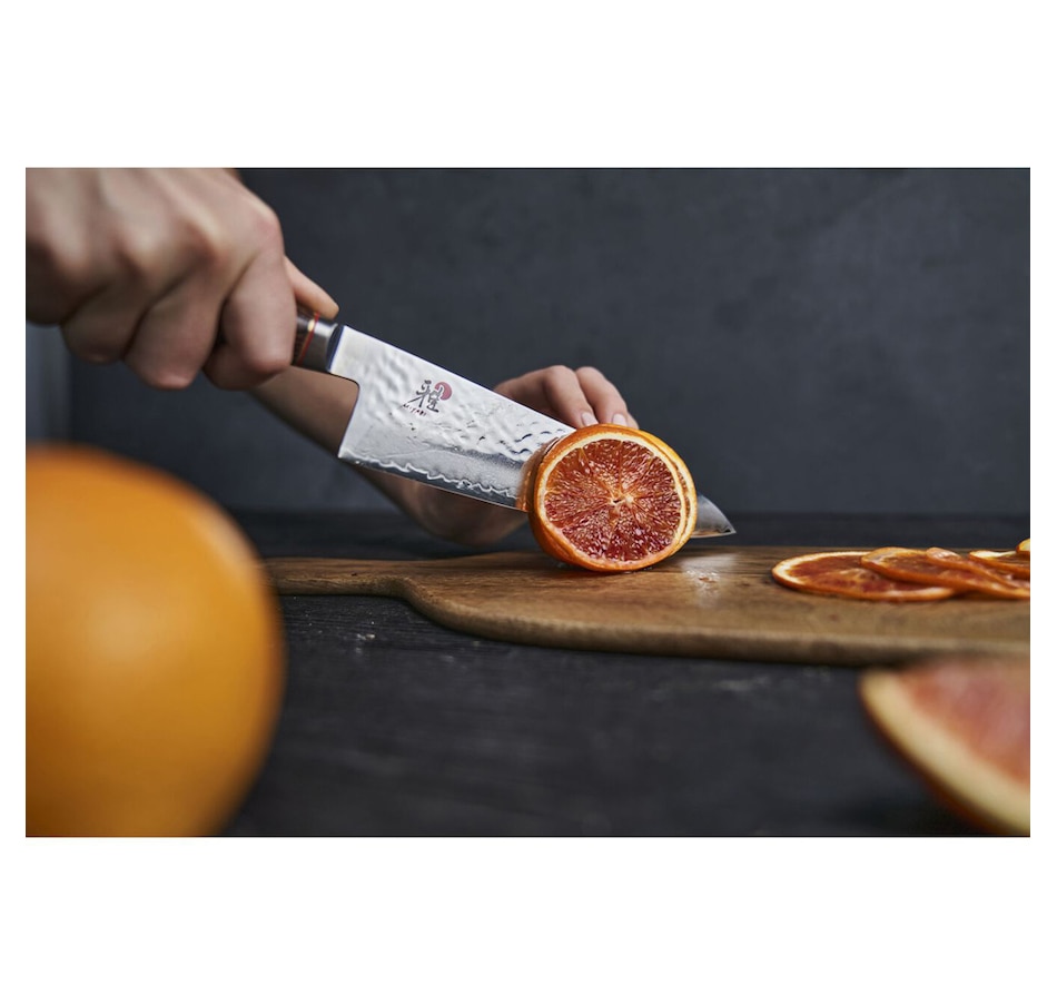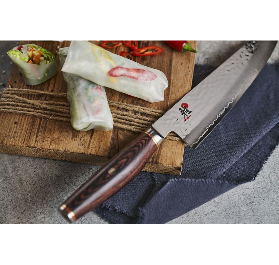 The blade is polished on both sides and finished by hand using Honbazuke honing. The handle on the other hand is made out of pakka wood, which has a subtle pattern and stands out thanks to its sturdiness and flexibility. The perfect balance enables a high level of comfort and lets you work without tiring, thus making the knife from Miyabi a useful cutting utensil in your kitchen.